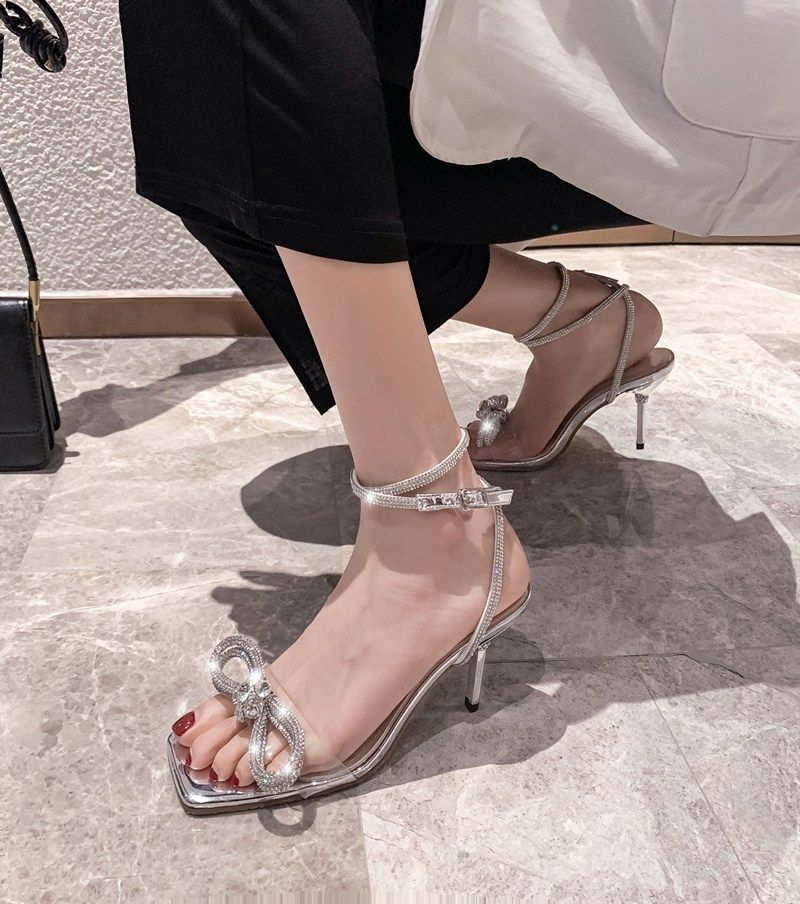 淘宝水钻凉鞋女夏2025年新款方头粗跟一字绑带蝴蝶结高跟鞋仙女风细跟