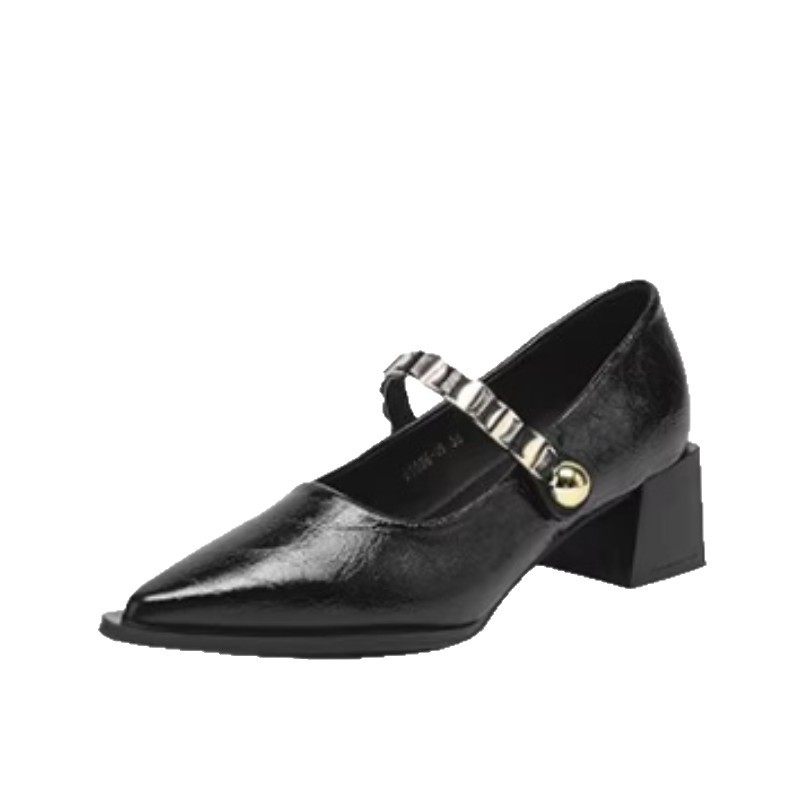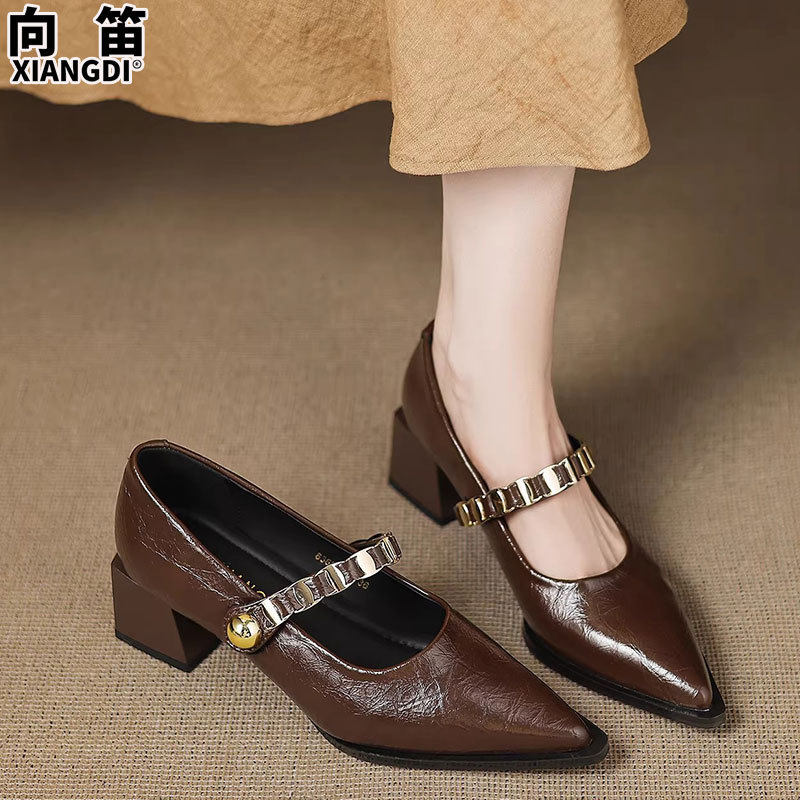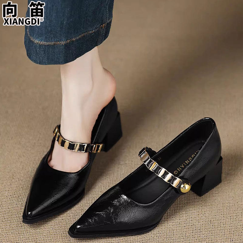 2026早春季新款羊皮版尖头高跟鞋,融合经典与现代美学,采用优质柔软羊皮打造,亲肤透气,穿着舒适。尖头设计拉长腿部线条,优雅显瘦;粗跟结构稳固支撑,兼顾时尚与日常行走的轻松感。玛丽珍风格的金属扣带点缀鞋面,复古俏皮中透出精致气质。浅口单鞋版型简约百搭,轻松驾驭通勤、约会或休闲场合。整体造型兼具小皮鞋的文艺感与高跟鞋的摩登魅力,是2026早春不可错过的时尚单品,为女性增添自信与优雅风采。