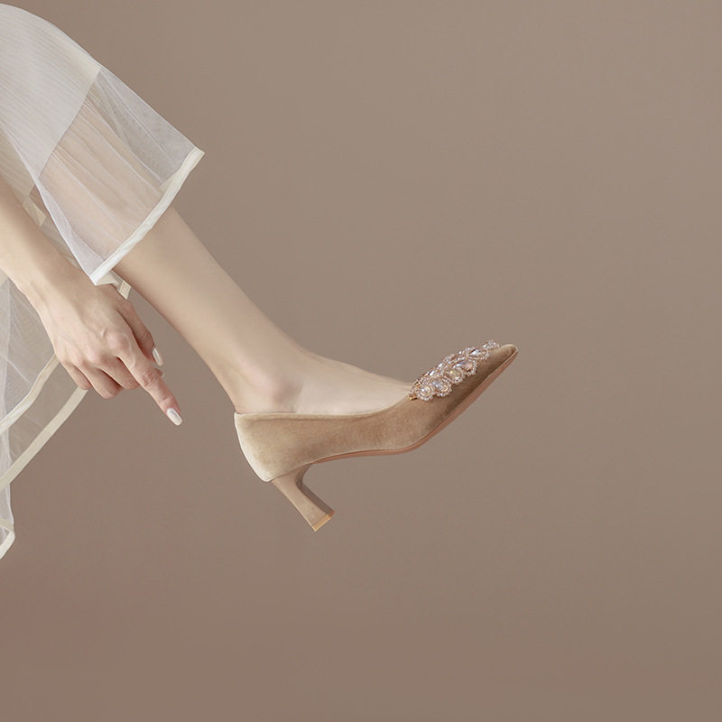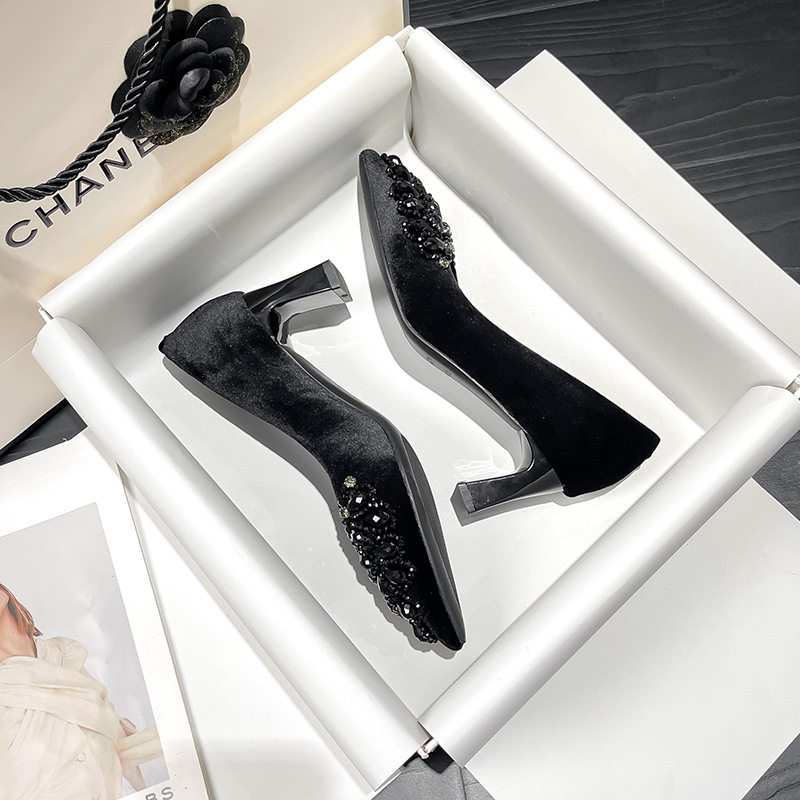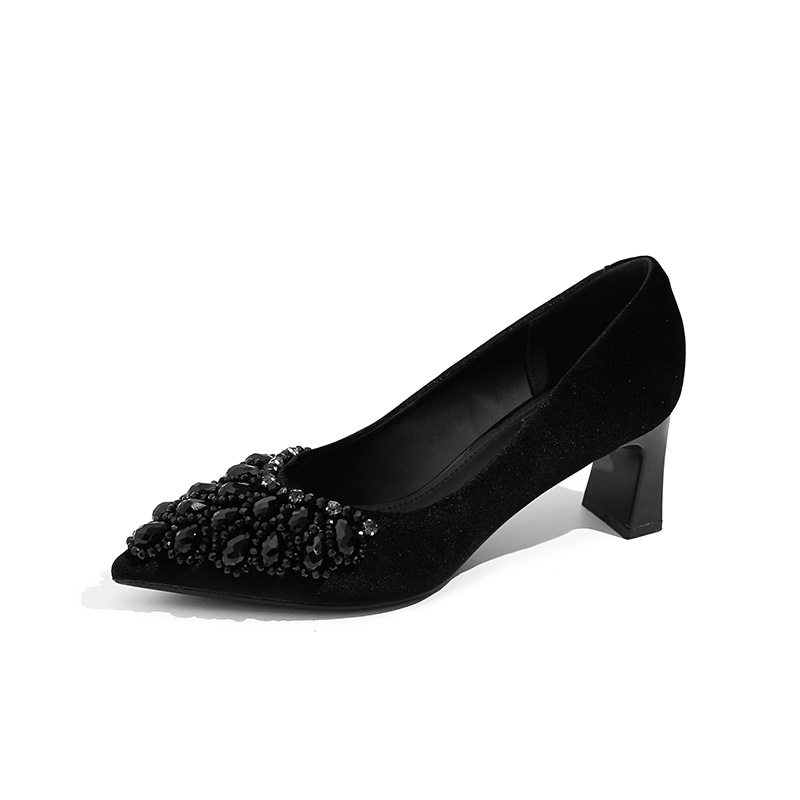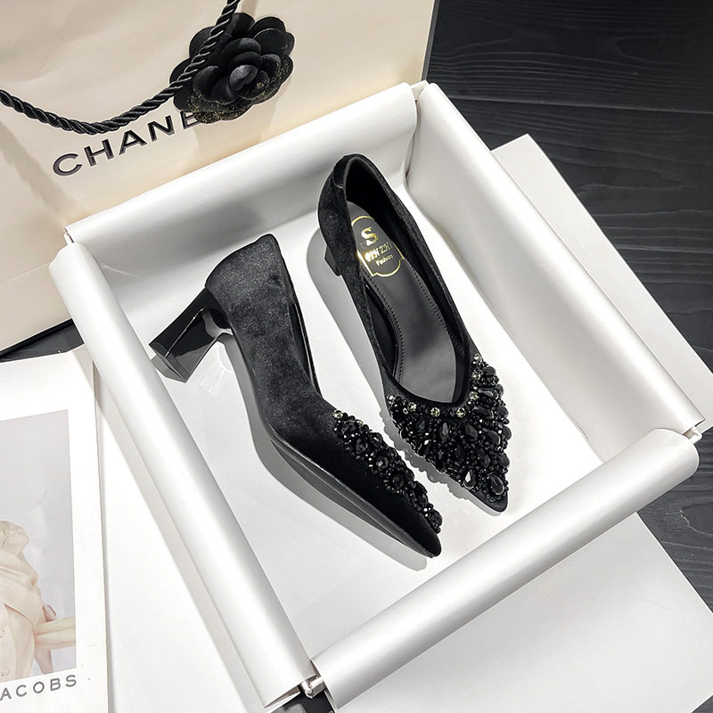 淘宝法式水钻马蹄跟单鞋女2025新款春秋季时尚粗跟尖头高跟鞋
