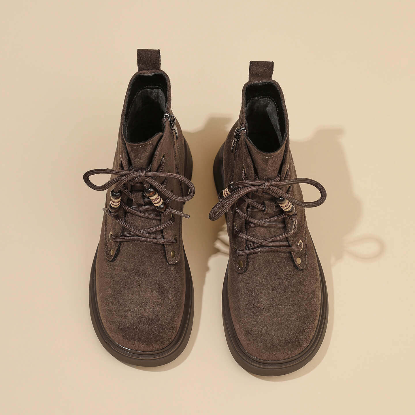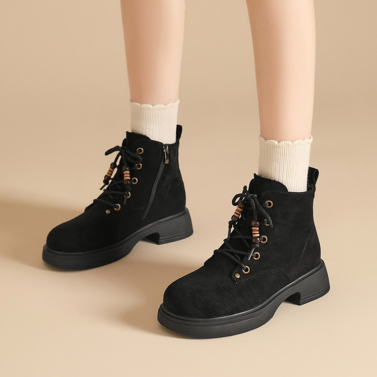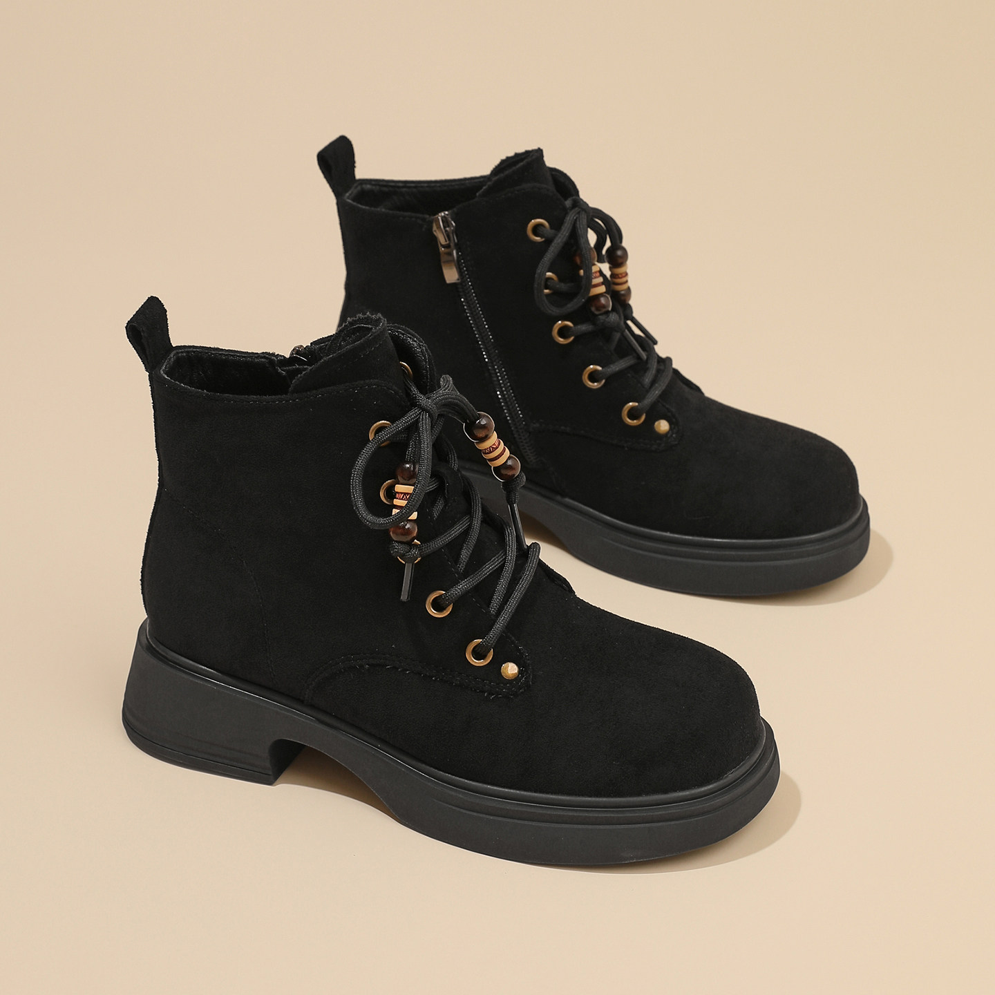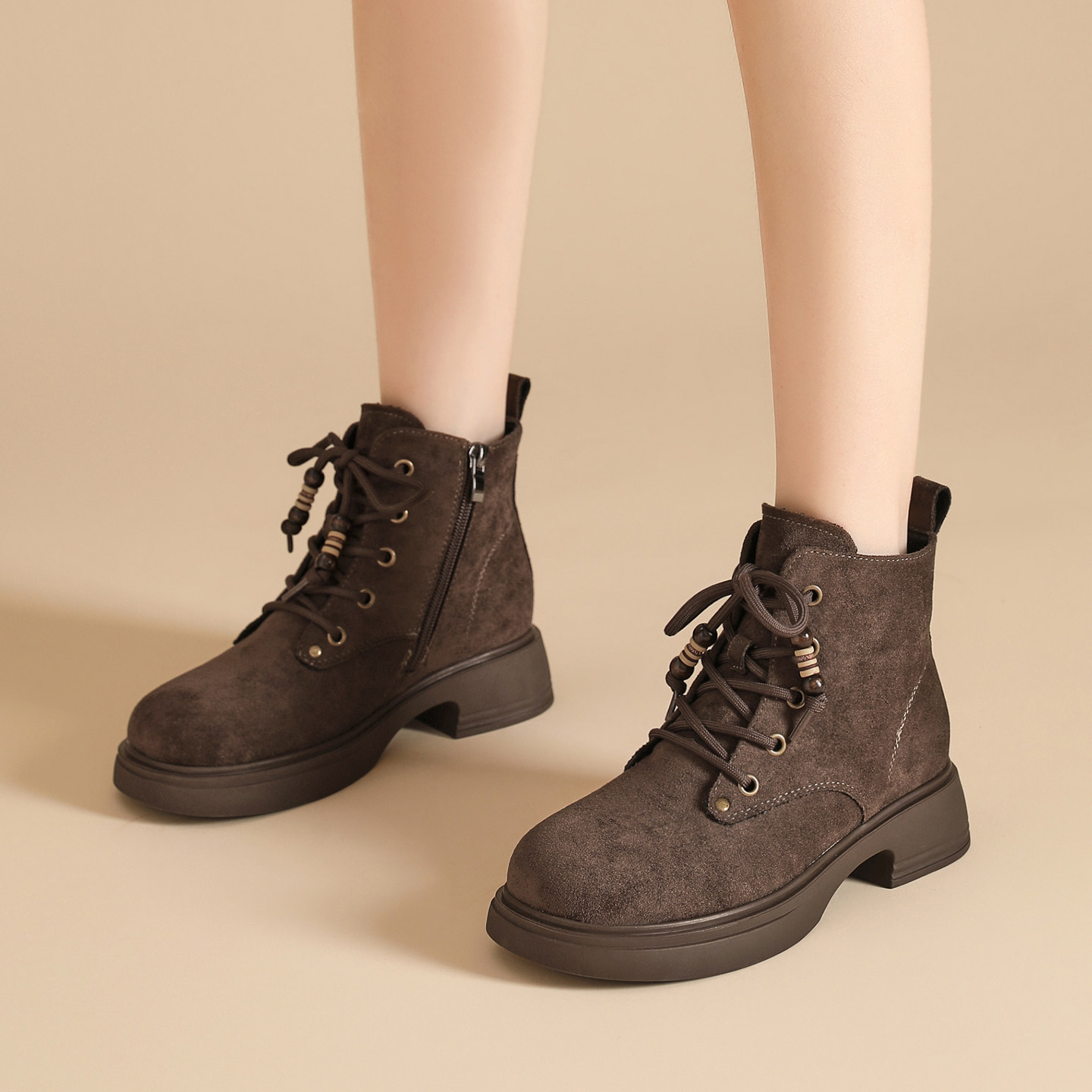 星期六通勤小短靴2025新款棕色高跟法式复古圆头马丁靴平底女鞋