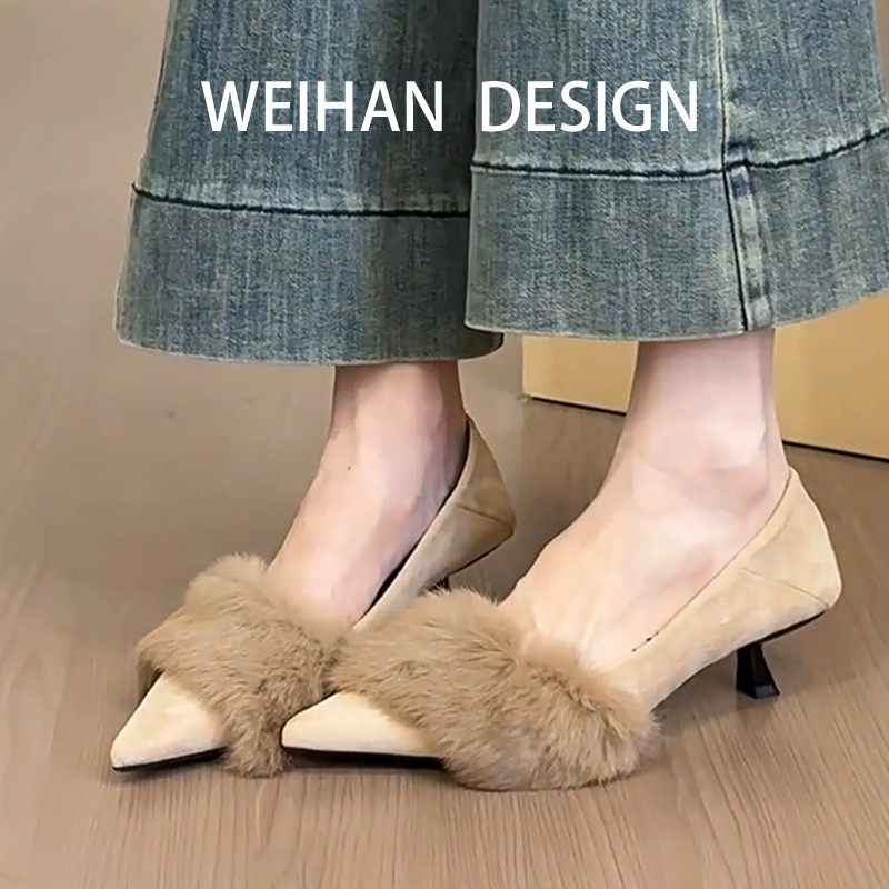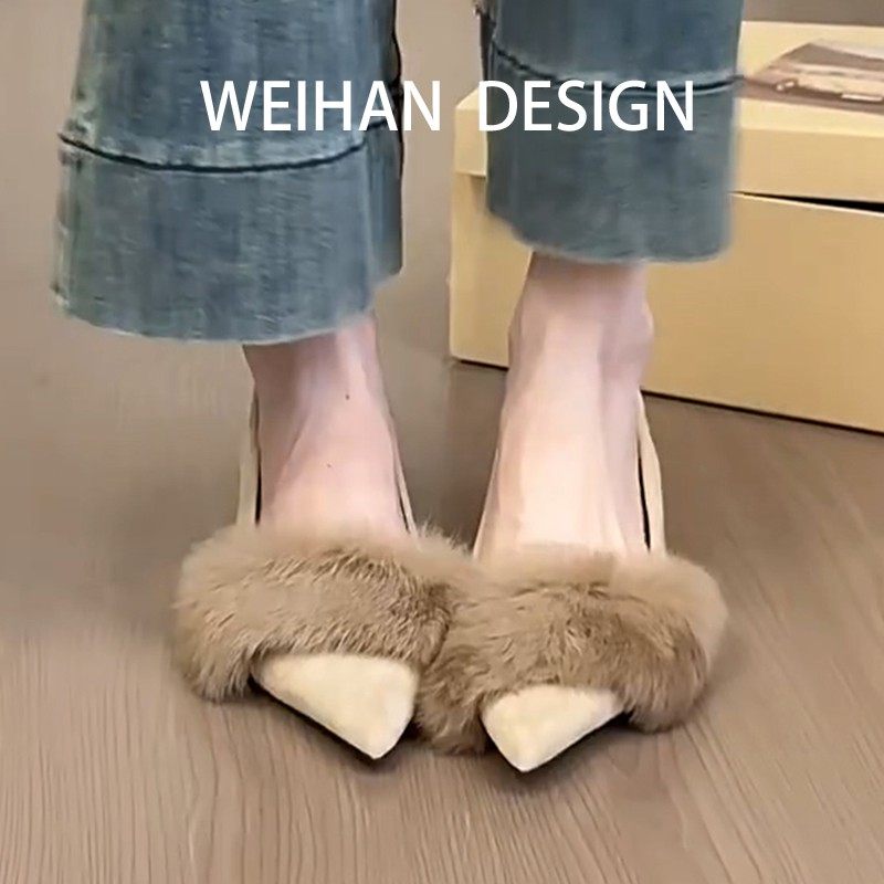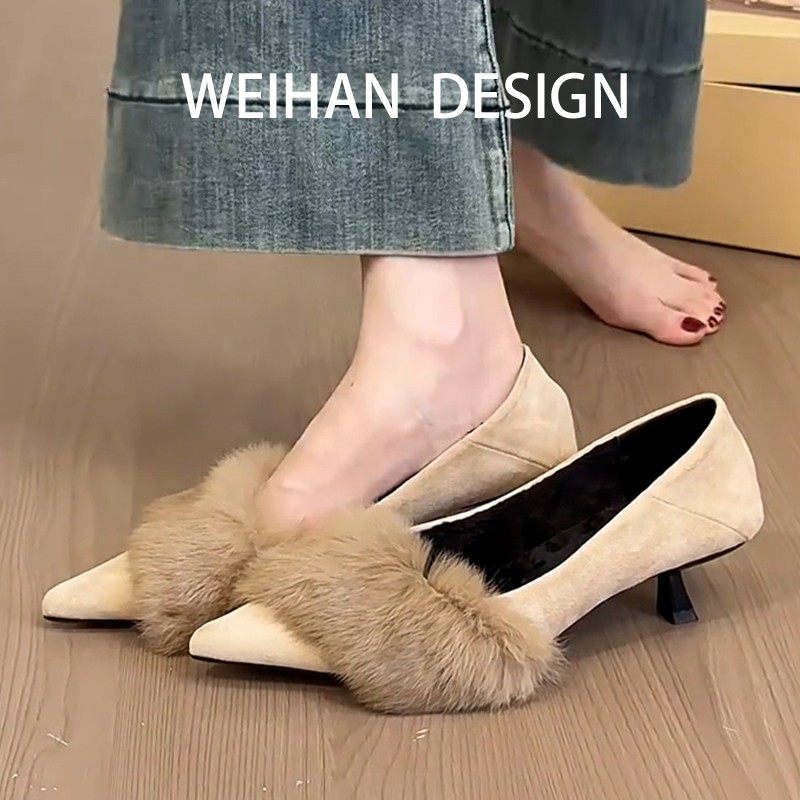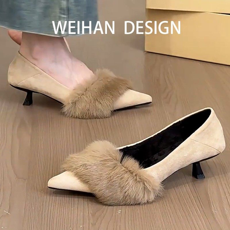 淘宝羊皮版!气质不累脚尖头高跟鞋女配裙加绒毛毛一脚蹬时髦性感单鞋