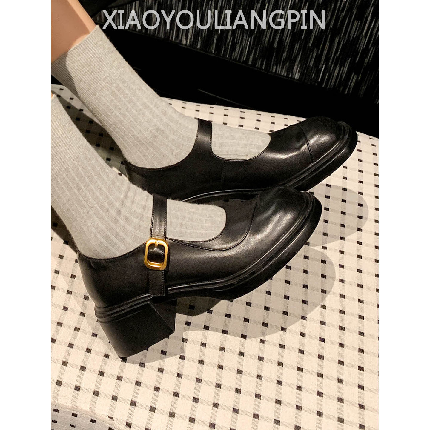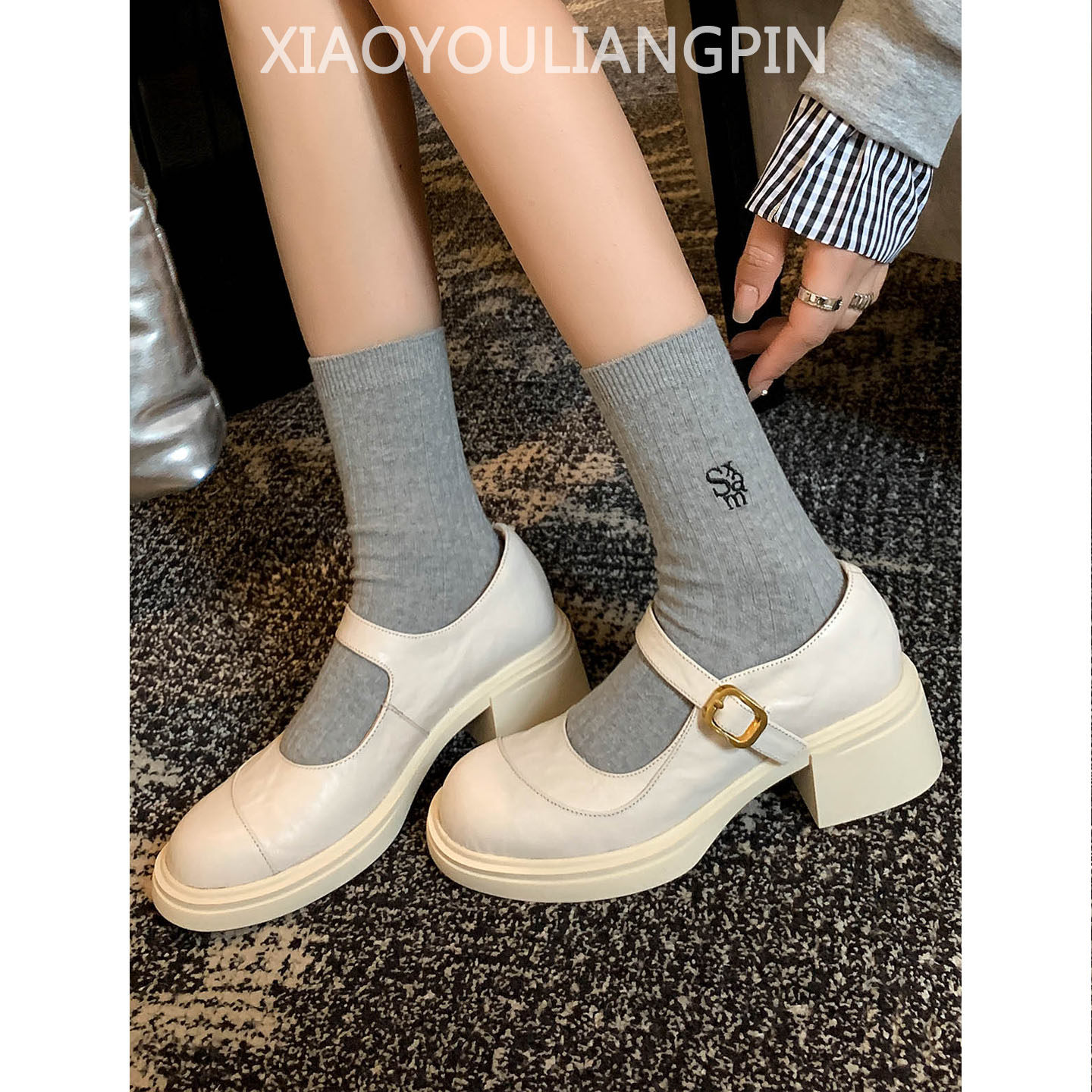 淘宝5.5cm真皮米白色厚底高跟鞋女粗跟单鞋2026新款一字扣带玛丽珍鞋