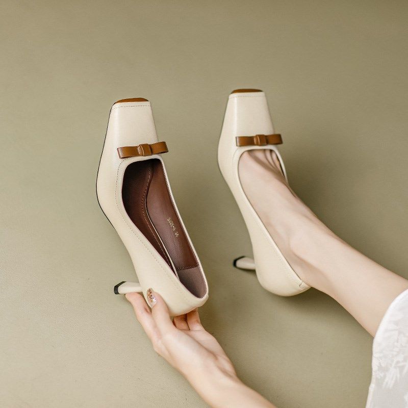淘宝法式小众设计感方头细高跟鞋女米白不累脚软漆皮浅口职业通勤单鞋