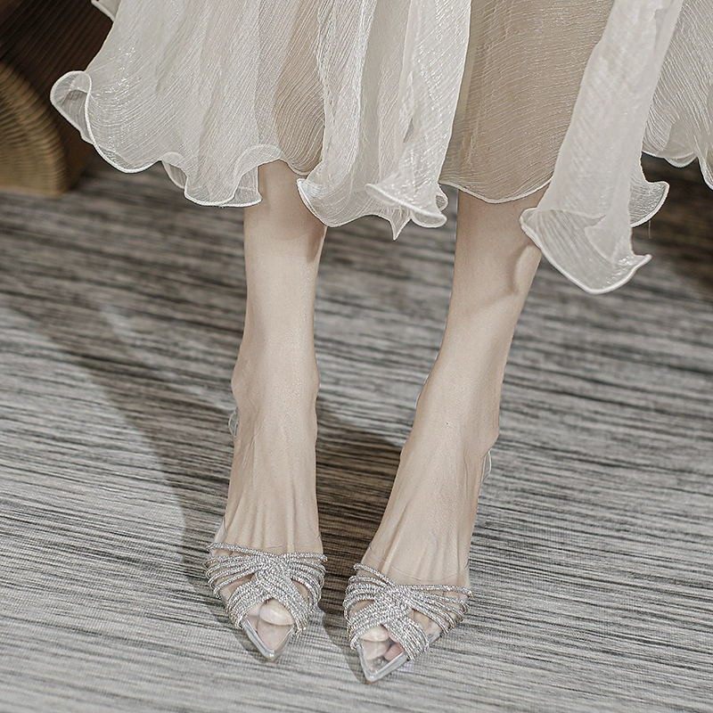 MissSmile 2025夏季新款尖头透明水钻高跟鞋一字凉拖,融合时尚与性感,打造夏日瞩目焦点。采用优质透明PVC材质,轻盈透气,搭配精致水钻装饰,闪耀夺目,尽显女性优雅魅力。尖头设计拉长腿部线条,一字带简约百搭,轻松驾驭裙装或裤装。高跟稳健舒适,适合日常出街、约会或派对等多种场合。外穿设计兼顾美观与实用,是今夏不可或缺的时尚单品,让每一步都自信闪耀,释放迷人风采。