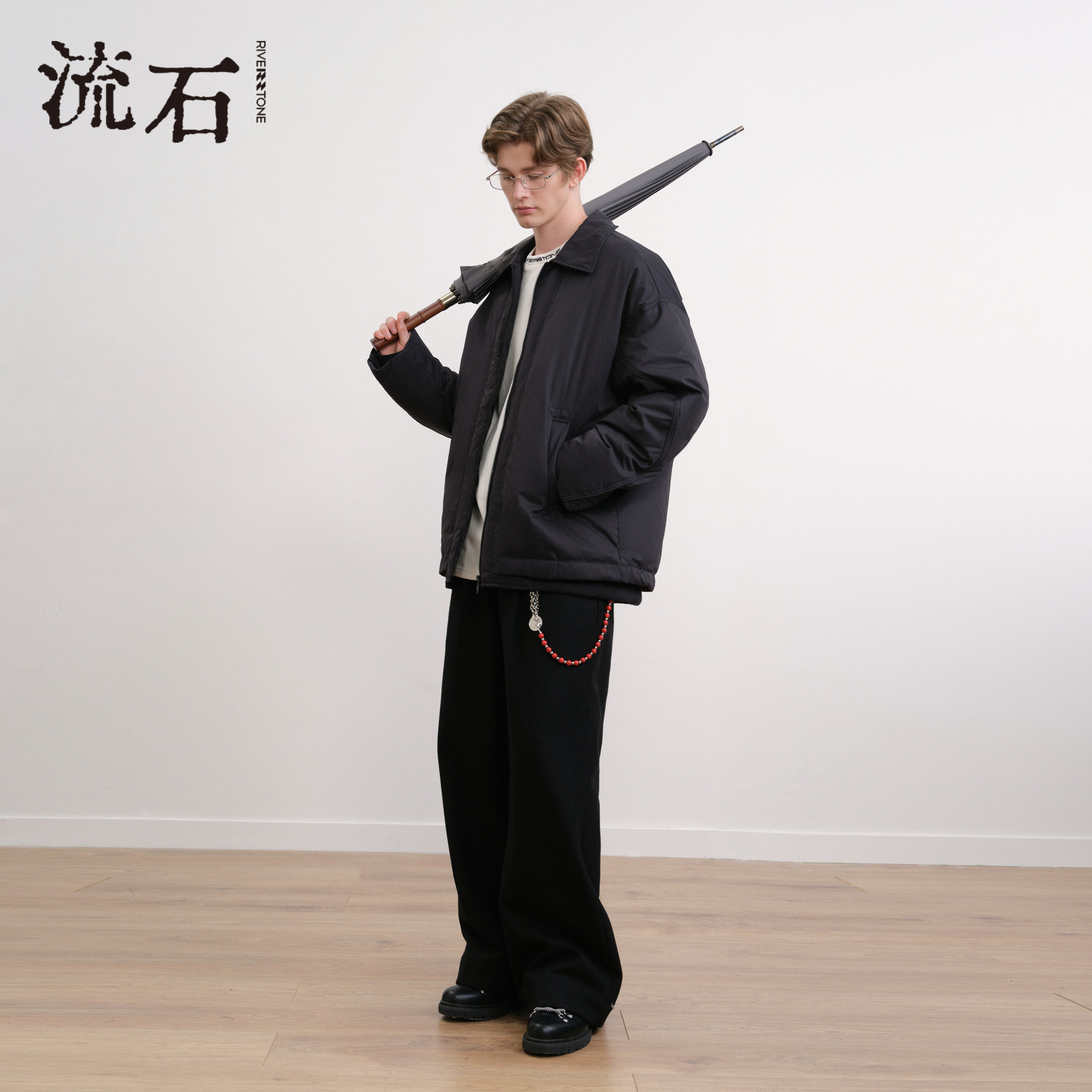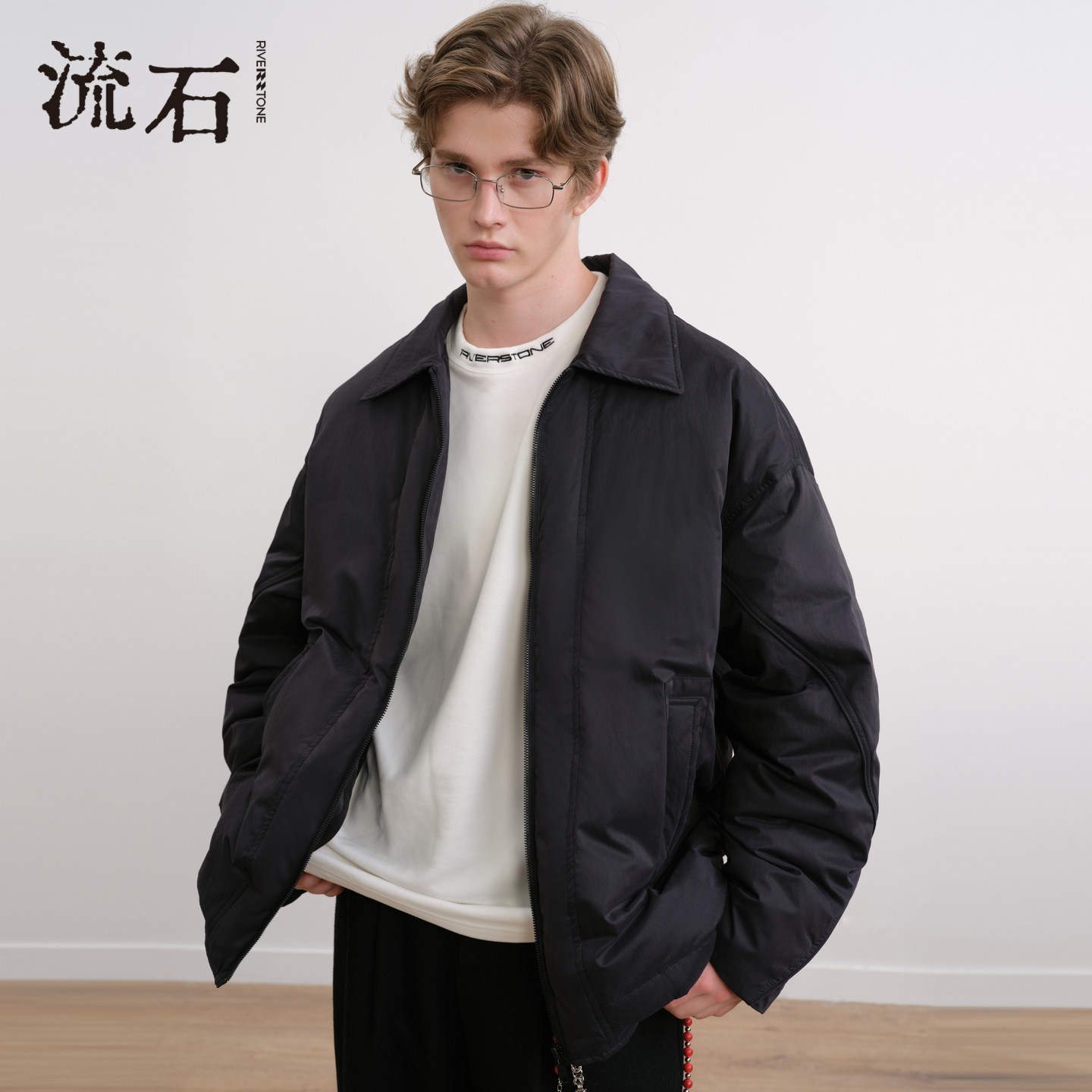 天猫流石男装黑色短款宽松羽绒夹克2025年冬季新款男士拼接白鸭绒外套