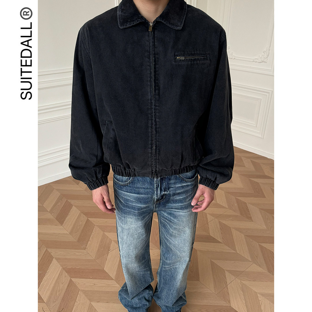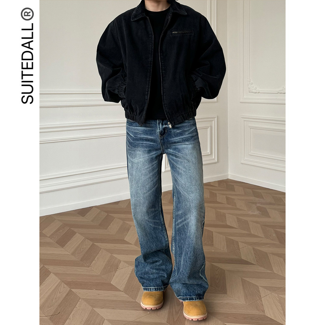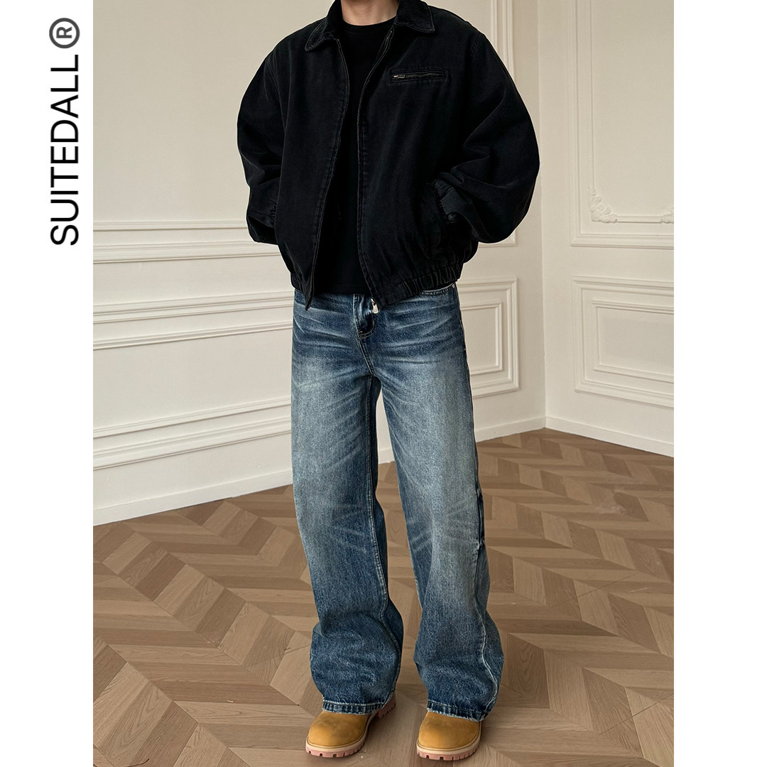 淘宝SUITEDALL水洗做旧斜纹牛仔外套 J97短宽加厚翻领百搭棉服冬男女