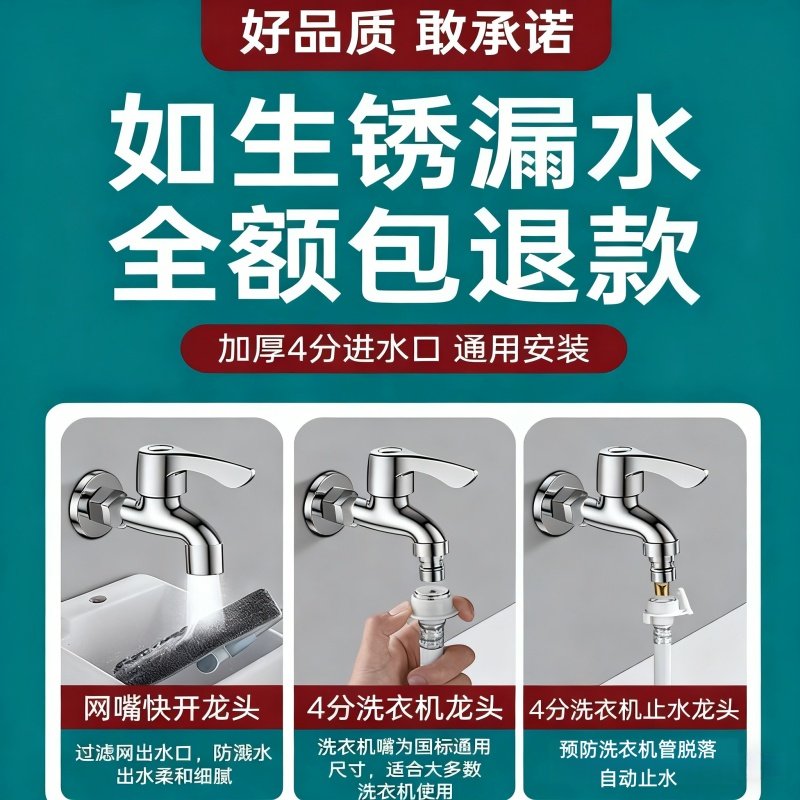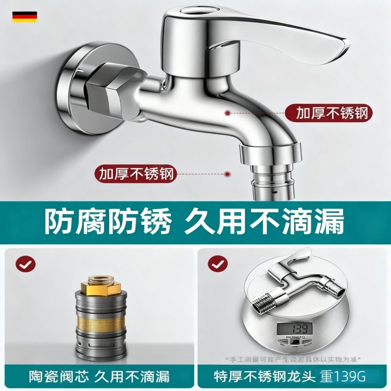 这款家用水龙头采用优质304不锈钢材质,耐腐蚀、抗生锈,确保长期使用安全卫生。专为洗衣机、拖把池等场景设计,配备4分入墙式接口,安装便捷,适配多种家庭水路系统。全铜阀芯结构,开关顺滑耐用,有效防止滴漏。单冷设计简洁实用,特别适合阳台、卫生间等空间。加长出水嘴设计,避免水流外溅,使用更省心。具备防冻性能,寒冷地区冬季使用更安心。产品通过严格质检,确保正品品质,是家庭日常清洁用水的理想选择,兼顾实用性与耐用性,提升居家生活品质。