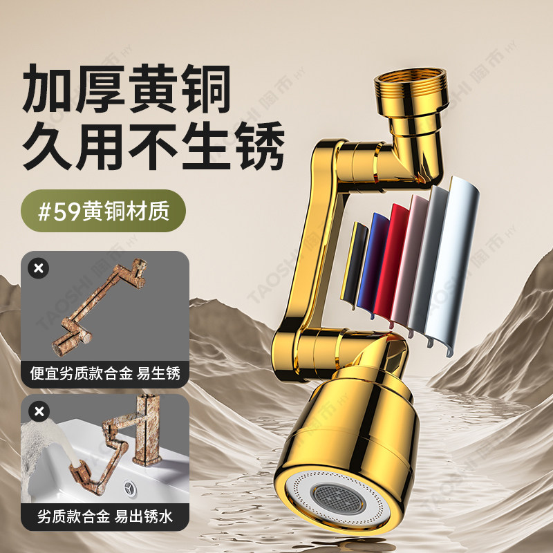 全铜多功能机械臂万向水龙头延伸洗脸盆起泡器接头防溅神器摇臂,采用优质全铜材质打造,坚固耐用、防锈防腐,有效延长使用寿命。其创新万向旋转设计,支持360°自由调节角度,轻松应对不同使用场景,实现精准控水。内置高效起泡器,水流柔和细腻,节水的同时有效防止飞溅,提升洗漱体验。可伸缩摇臂结构,灵活适配各类洗脸盆,安装简便,无需工具。适用于家庭、酒店、公共场所等,是提升卫浴空间实用性与舒适度的理想之选,兼顾美观与功能,让日常用水更加便捷高效。