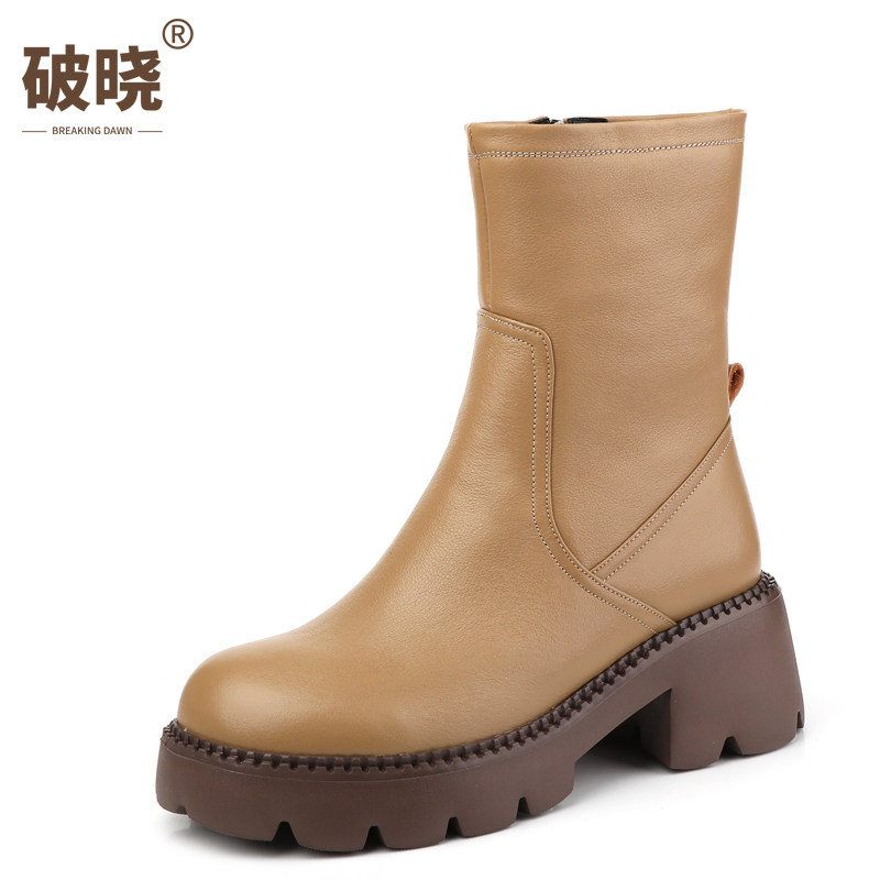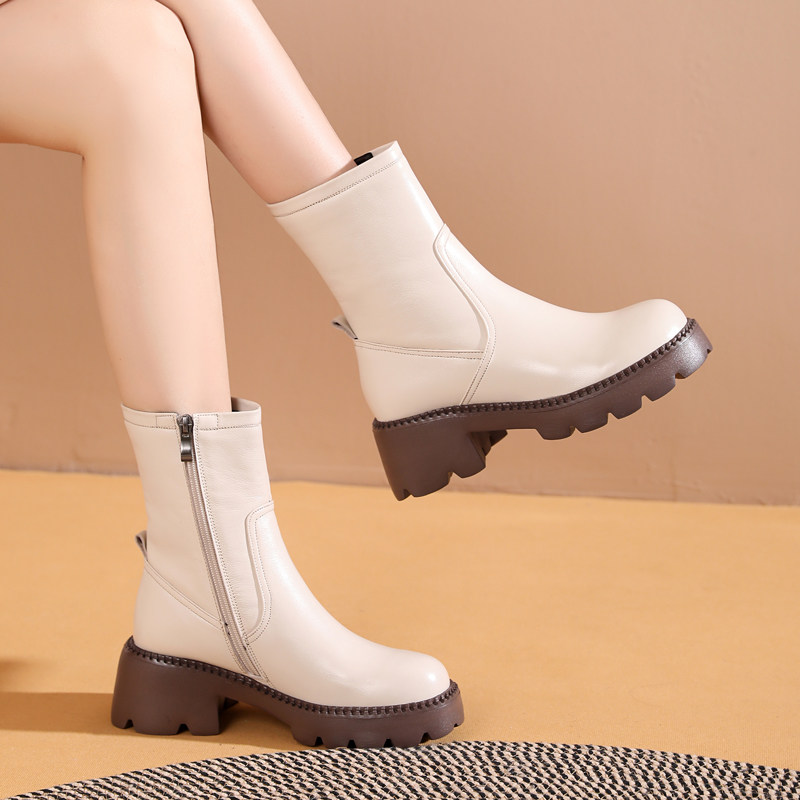 天猫厚底真皮马丁靴高跟瘦瘦靴秋冬网红白色中筒女靴子软底加绒雪地靴