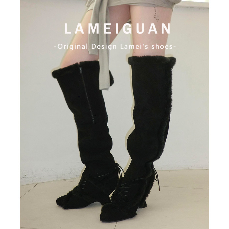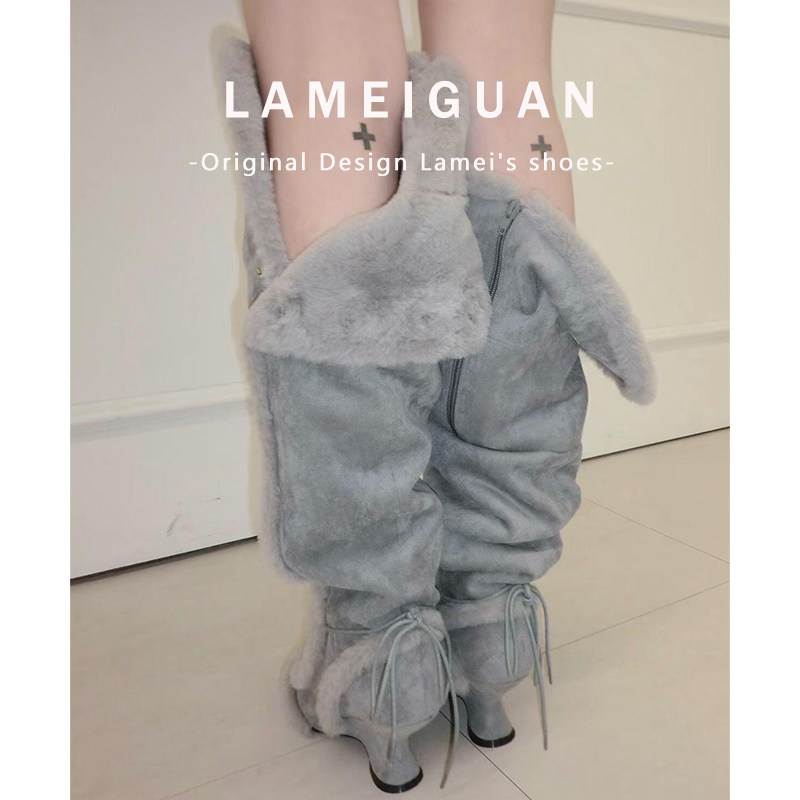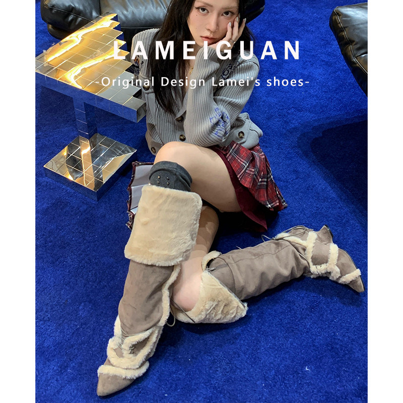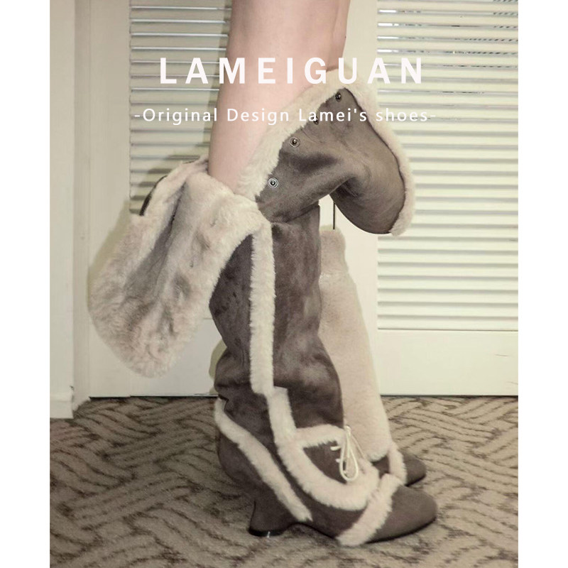 淘宝灰色复古加绒尖头坡跟长筒堆堆靴女冬2025新款毛毛高跟雪地骑士靴