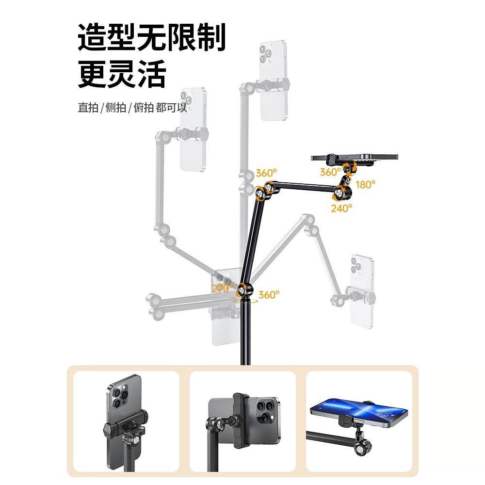 wonew七彩蜗牛直播手机专用支架是一款专为直播、追剧、俯拍设计的智能拍摄设备。采用落地式稳固结构,支持手机与平板双重使用,配备360度旋转云台,可自由调节角度,满足对镜直播、美食拍摄、网课学习等多种场景需求。支架高度可调,俯拍视角清晰稳定,解放双手,轻松实现多角度创作。内置环形补光灯,提供柔和均匀的光线,提升画面质感,尤其适合夜间或光线不足环境使用。整体设计轻便灵活,操作简便,是主播、学生、上班族及摄影爱好者的理想懒人支架,让拍摄更自由、更专业。