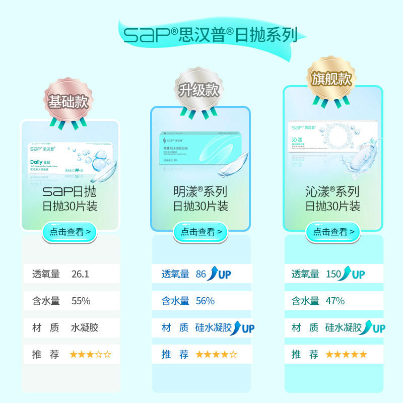 SAP明漾隐形眼镜怡漾硅水凝胶日抛30片,采用先进硅水凝胶材质,透氧性高,佩戴舒适,适合长时间用眼人群。镜片柔软贴合角膜,有效锁水保湿,减少干涩感,带来全天候清晰视觉体验。本品为日抛设计,无需护理,使用便捷又卫生,特别适合忙碌的都市人群或偶尔佩戴者。当前批次效期充足,有效期高于6个月,品质有保障,可放心购买与使用。无论是日常通勤、办公还是运动场合,都能提供稳定舒适的佩戴感受。选择SAP明漾,就是选择安全、健康与清晰的视界。