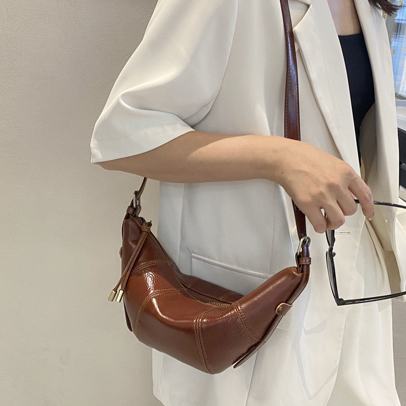 这款头层油蜡牛皮单肩斜挎小包,采用优质头层牛皮经油蜡工艺处理,质感细腻,光泽自然,随使用时间愈显韵味。包型为时尚新月牙设计,线条流畅,兼具复古与休闲气息,得名“牛角包”,造型独特吸睛。宽肩带设计舒适减压,可单肩可斜挎,解放双手,出行更便捷。内部空间合理,轻松容纳手机、口红、卡片等日常小物,满足都市女性通勤、约会或短途出行需求。无论是搭配牛仔裤还是连衣裙,都能轻松驾驭,是兼具实用性与设计感的百搭单品,展现低调优雅的时尚态度。