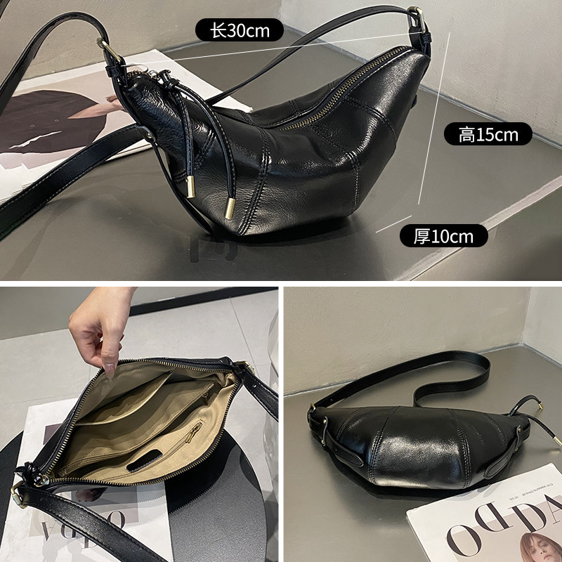 天猫头层油蜡牛皮单肩斜挎小包牛角包女时尚休闲宽肩带手机包新月牙包