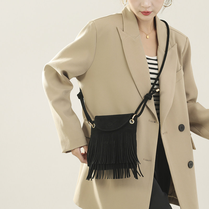 这款超火波西米亚民族风手机包,融合复古麂皮绒磨砂质感与精致流苏设计,尽显自由不羁的异域风情。迷你小巧的斜跨单肩包型,轻便实用,完美适配日常出行,轻松收纳手机、钥匙、口红等随身小物。麂皮绒材质柔软细腻,触感高级,搭配民族风刺绣或金属装饰,细节满满,彰显独特个性。无论是搭配长裙、牛仔还是休闲装,都能瞬间提升整体造型的时尚感。流苏随步伐轻盈摆动,增添灵动气息,是追求个性与风格的潮人必备单品。复古与潮流兼具,实用与美观并存,轻松驾驭各种场合,成为街拍焦点。