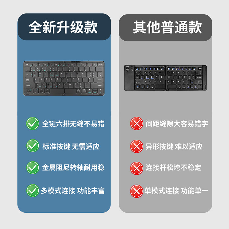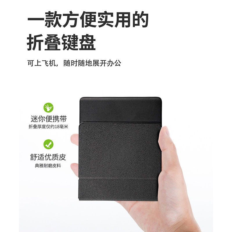 虎克蓝牙无线折叠键盘是一款专为移动办公设计的便携套装,支持多设备连接,兼容iPad、平板、手机及笔记本电脑。采用创新三折式设计,展开即为全尺寸键盘,提供舒适打字体验,折叠后仅手掌大小,轻松放入口袋或包中。配备高精度触控板与静音按键,操作流畅安静。套装还包含无线鼠标,实现键盘+鼠标一体化高效操控。通过蓝牙5.0技术,连接稳定、响应迅速,续航长达数周。无论是出差、咖啡馆办公还是居家学习,虎克套装都能大幅提升效率,是追求便携与性能用户的理想之选。