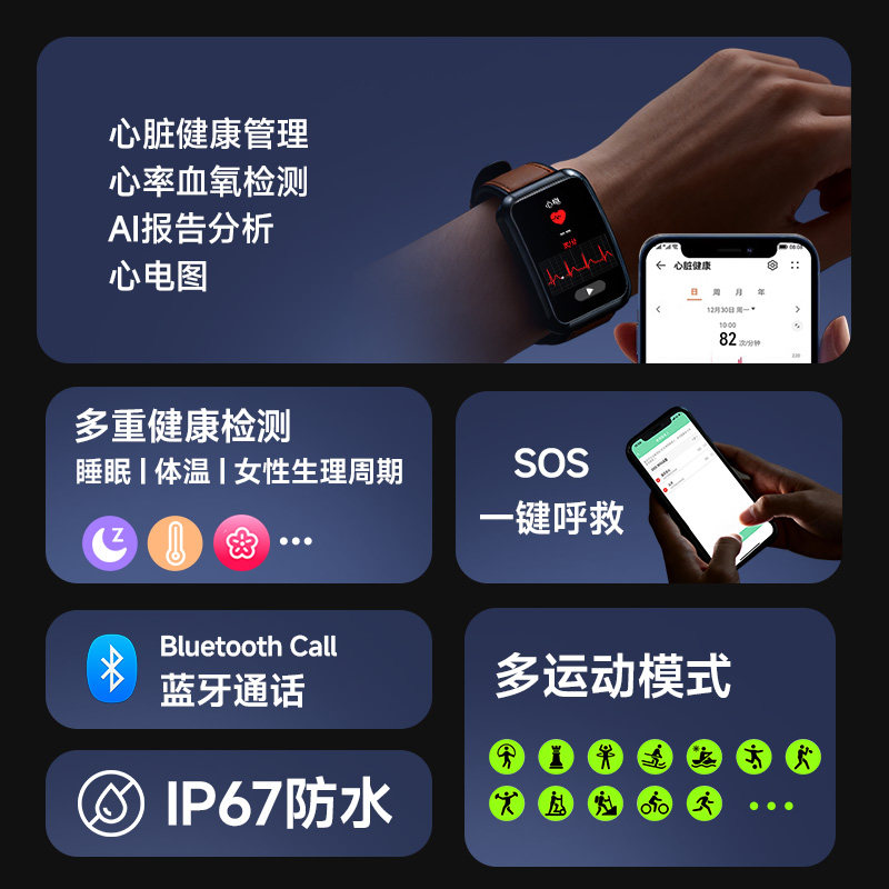 【政府补贴15%】KPEP高精度健康智能手环,专为关注健康的用户设计,集成血糖趋势分析、血压监测、心电检测、心率血氧及睡眠质量评估等多重功能,数据精准可靠,助力日常健康管理。采用先进传感器与AI算法,支持运动模式识别,适用于跑步、健走等多种场景,实时追踪身体状态。大屏显示、长续航、IP68防水设计,操作简便,特别适合中老年人使用。现享受政府15%专项补贴,性价比更高,是家庭健康守护的理想之选。早监测、早预防,让科技为您的健康保驾护航。