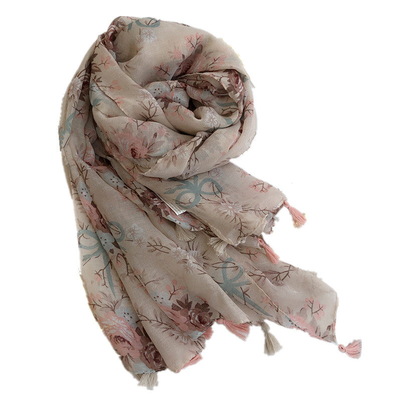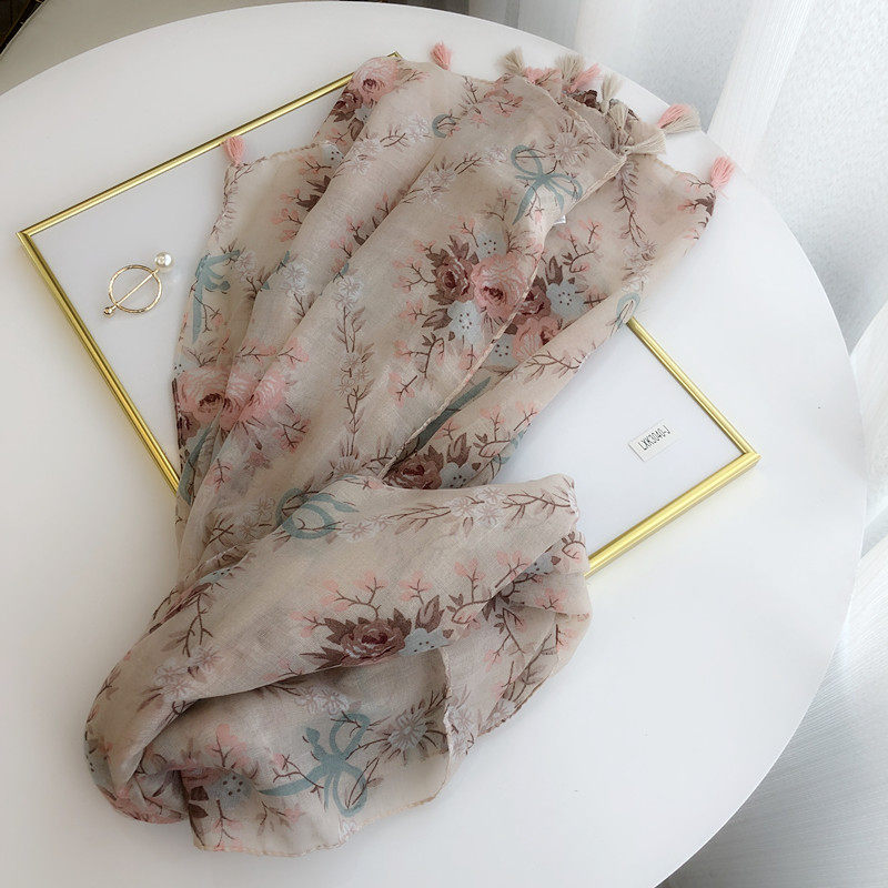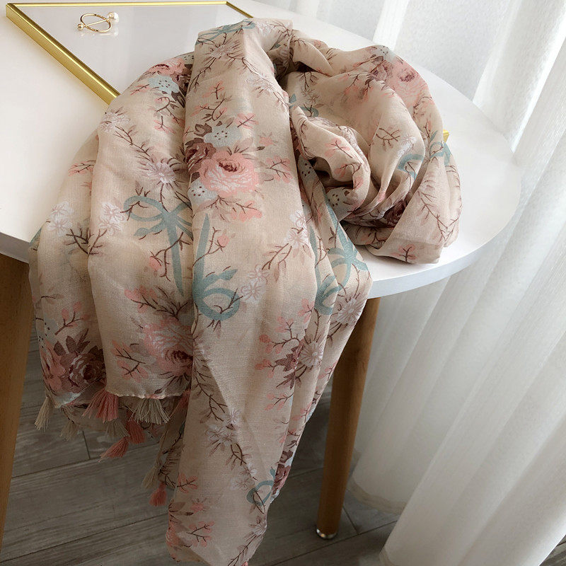 淘宝肉粉色碎花清新花朵棉麻围巾防晒披肩两用女纱巾丝巾春秋夏季薄款