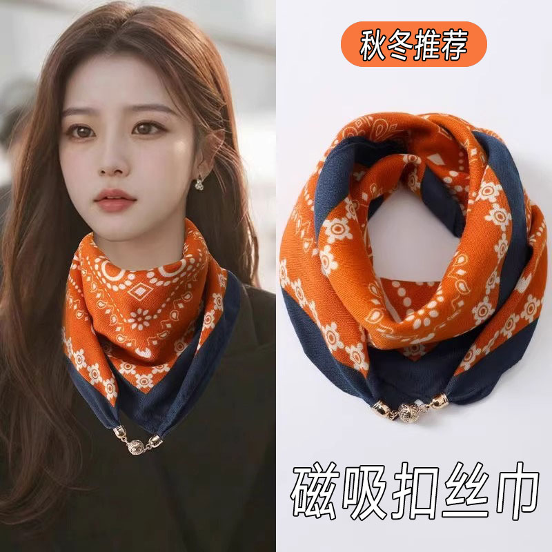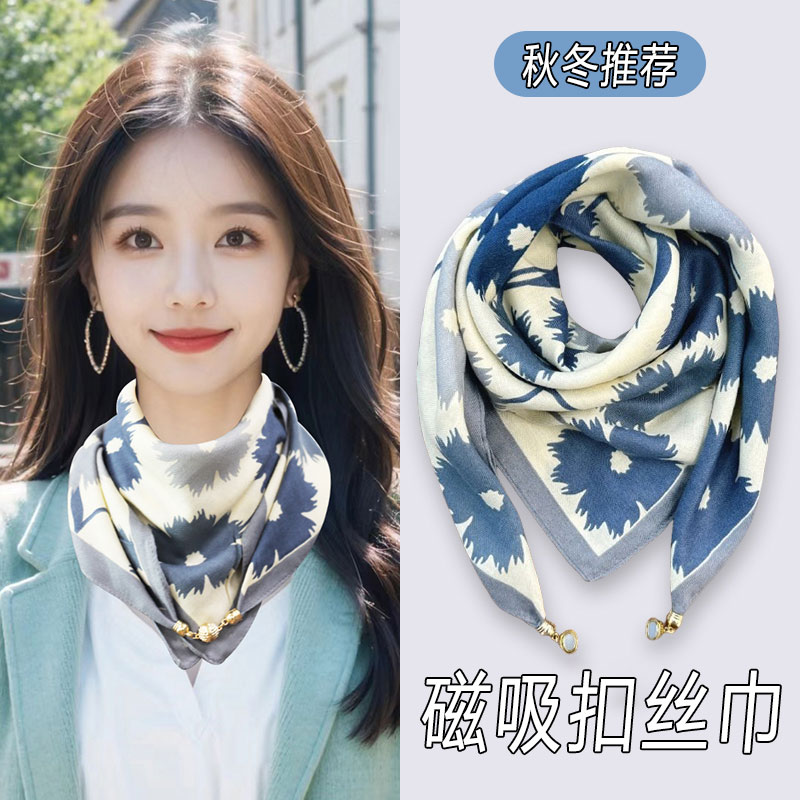 天猫2025新款磁吸扣丝巾女秋冬懒人薄款方巾护颈围巾围脖时尚百搭小方