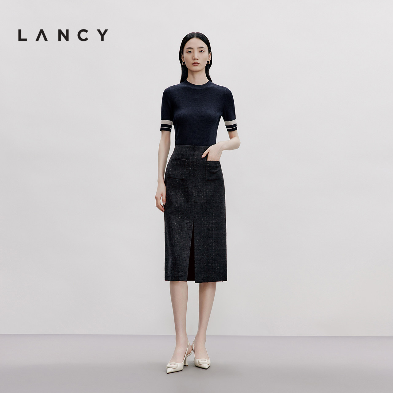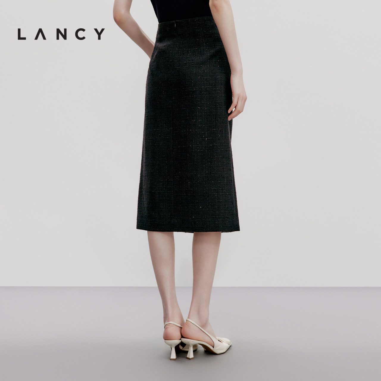 LANCY/朗姿2024秋季新款黑色花呢小香风中长半身裙,以经典优雅为设计理念,融合现代剪裁与复古韵味。采用高品质花呢面料,质感挺括,纹理细腻,彰显高级品味。直筒版型修饰身形,中长长度恰到好处,前开叉设计增添灵动气息,行走间尽显从容气质。精致滚边与金属纽扣点缀,延续小香风经典元素,细节考究。无论是搭配针织衫、衬衫还是西装外套,都能轻松打造知性干练或温柔优雅的造型,适合通勤、约会等多种场合,是都市女性衣橱中不可或缺的时尚单品。