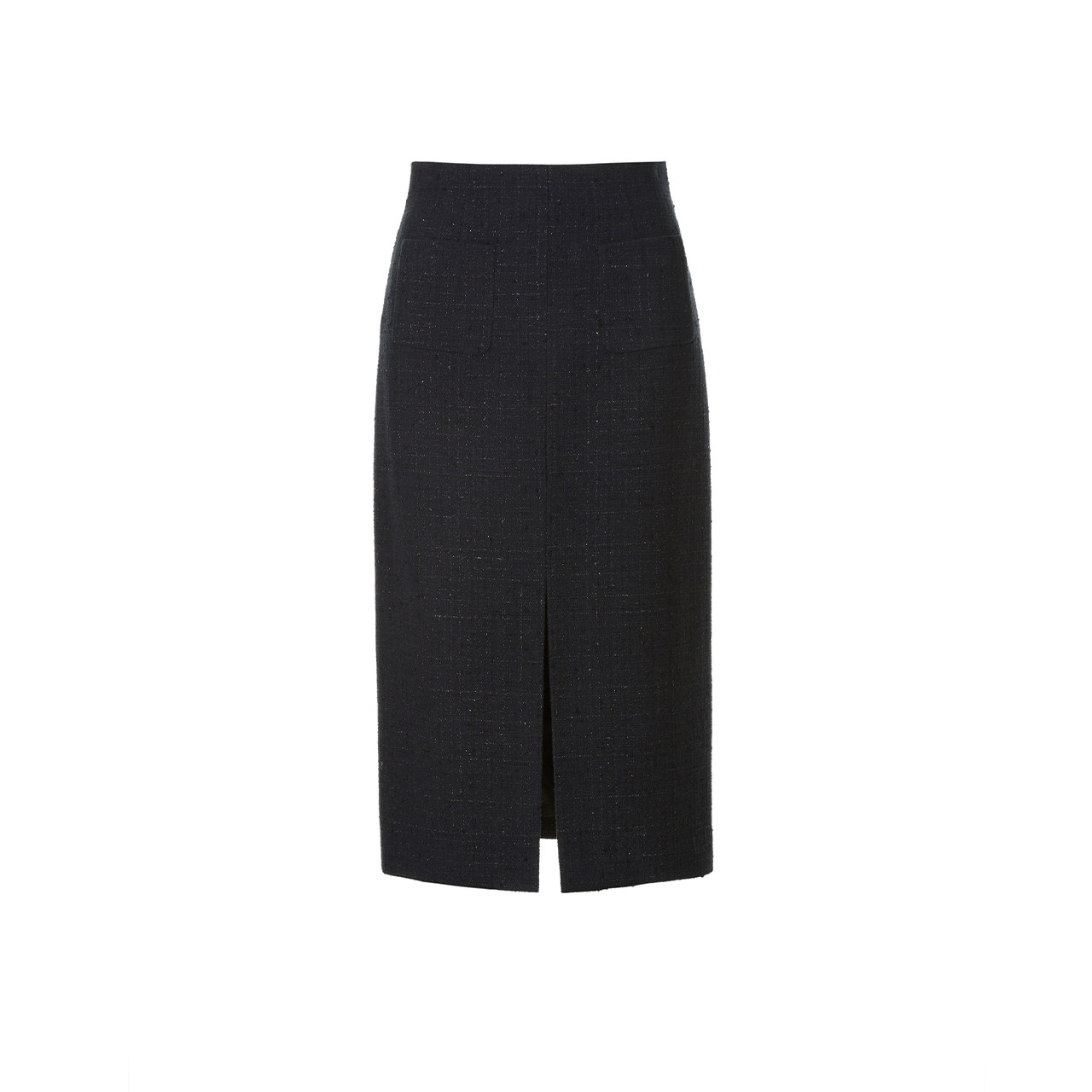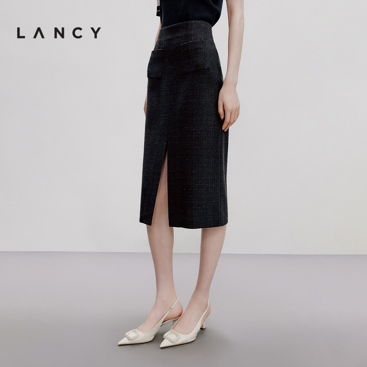 天猫LANCY/朗姿2024秋新款黑色花呢小香风中长半身裙前开叉直筒半裙女