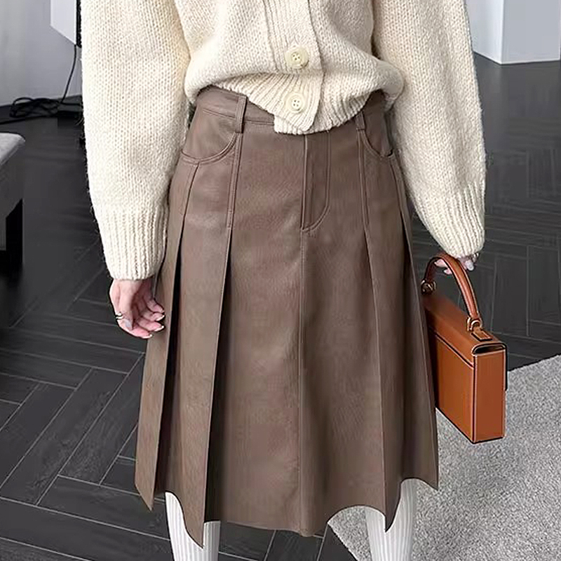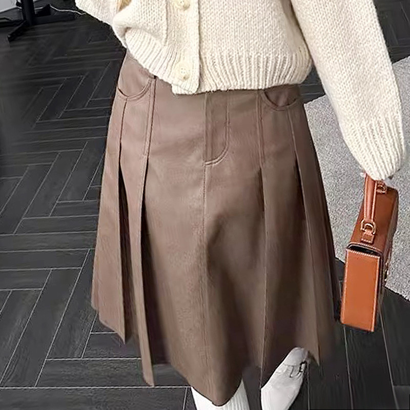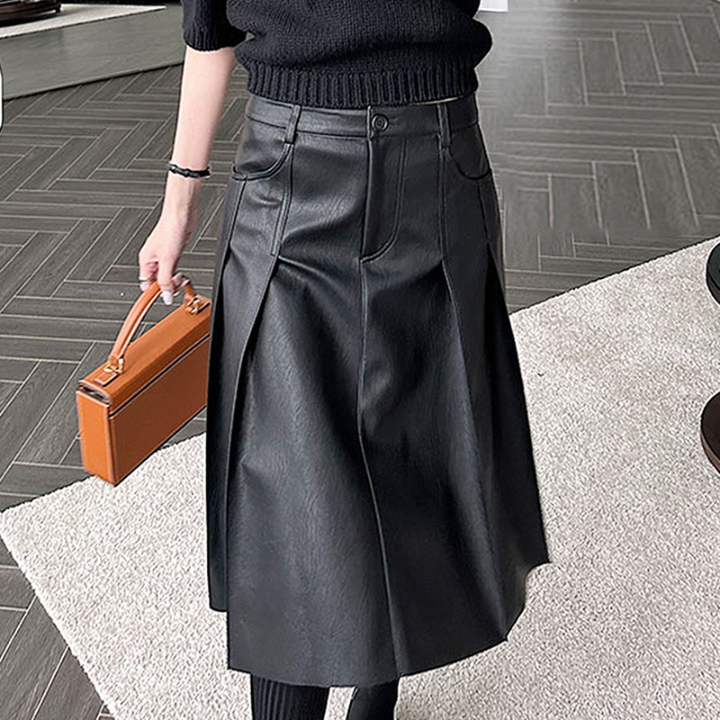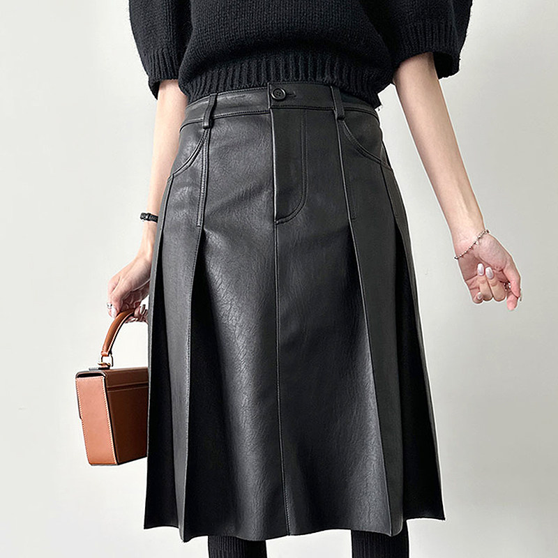 淘宝韩国chic秋季复古洋气高腰双口袋休闲百搭百褶黑色PU半身裙皮裙女