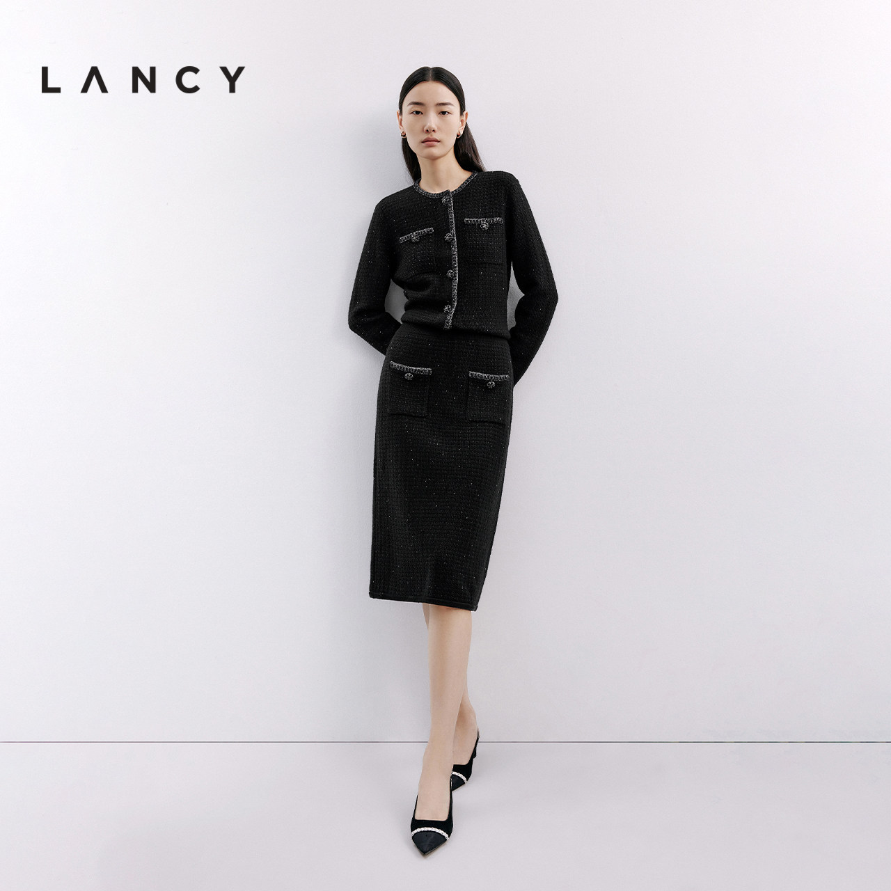 LANCY/朗姿2024秋季新款高腰直筒细闪小香风半身裙针织套装,融合经典优雅与现代时尚。采用精致针织面料,融入细腻闪丝元素,在光线下呈现低调奢华光泽。高腰直筒剪裁巧妙修饰腰腹线条,拉长腿部比例,展现女性干练气质。小香风设计搭配金属扣饰,彰显品牌质感与法式浪漫。半裙与针织上衣成套搭配,轻松打造通勤、约会或休闲场合的得体造型。整体版型修身不紧身,舒适有型,兼具实穿性与设计感,是2024秋季衣橱不可或缺的优雅单品,诠释都市女性的自信与魅力。