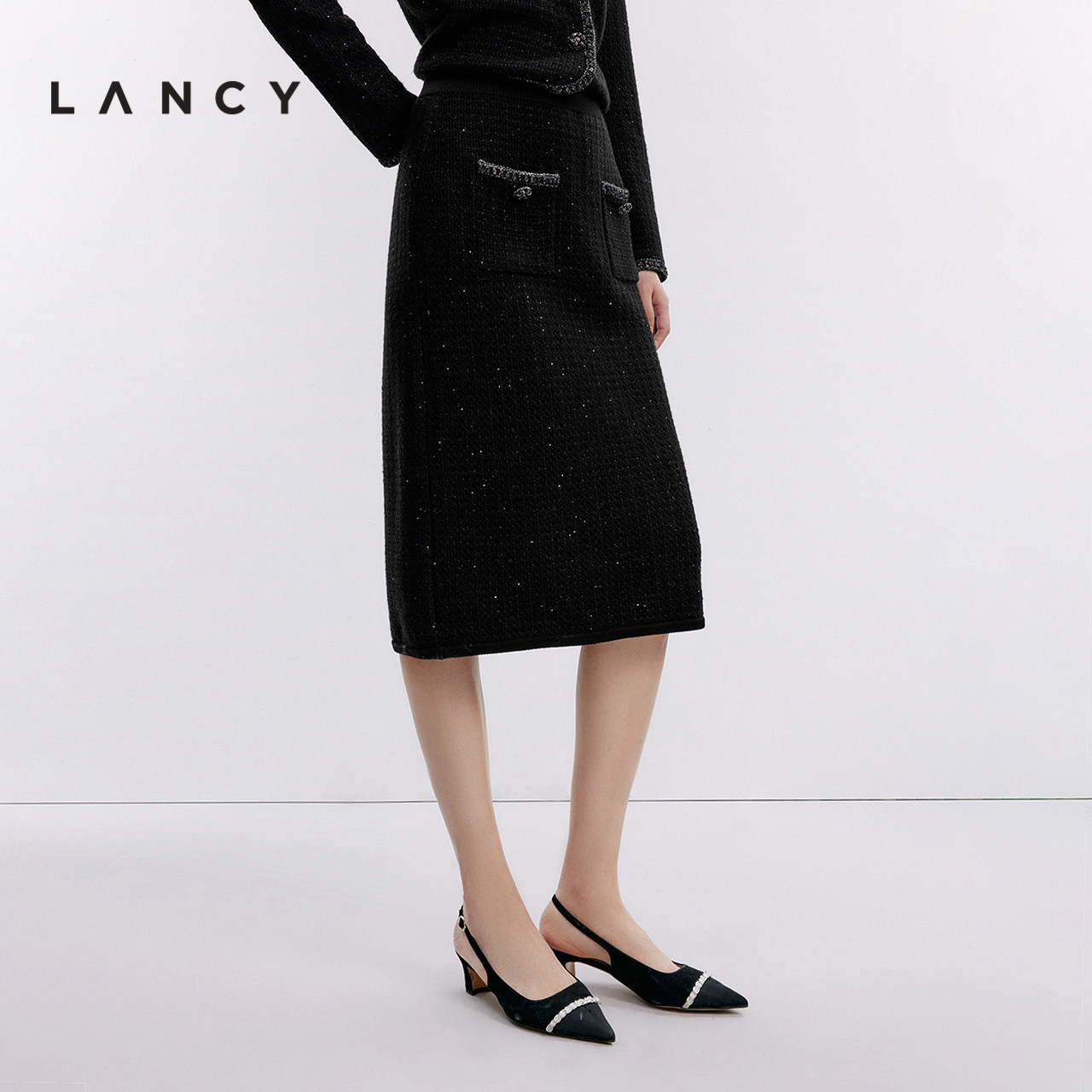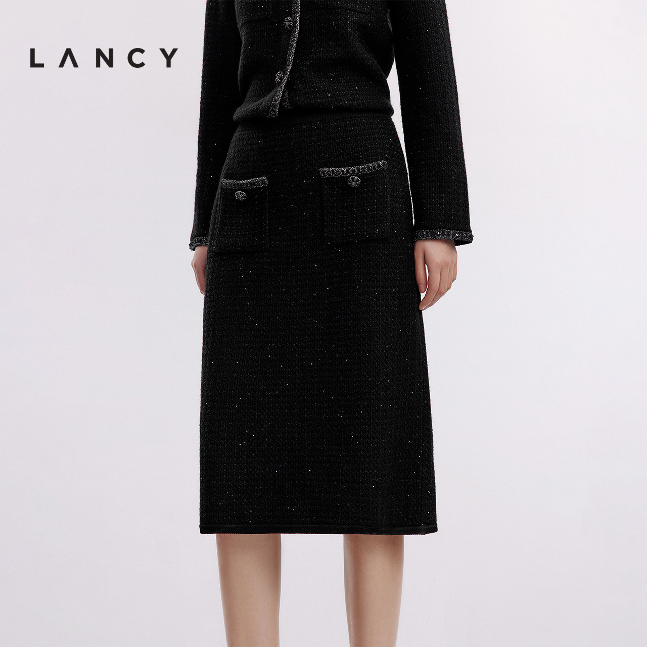 天猫LANCY/朗姿2024秋新款高腰直筒细闪小香风半身裙针织套装半裙女