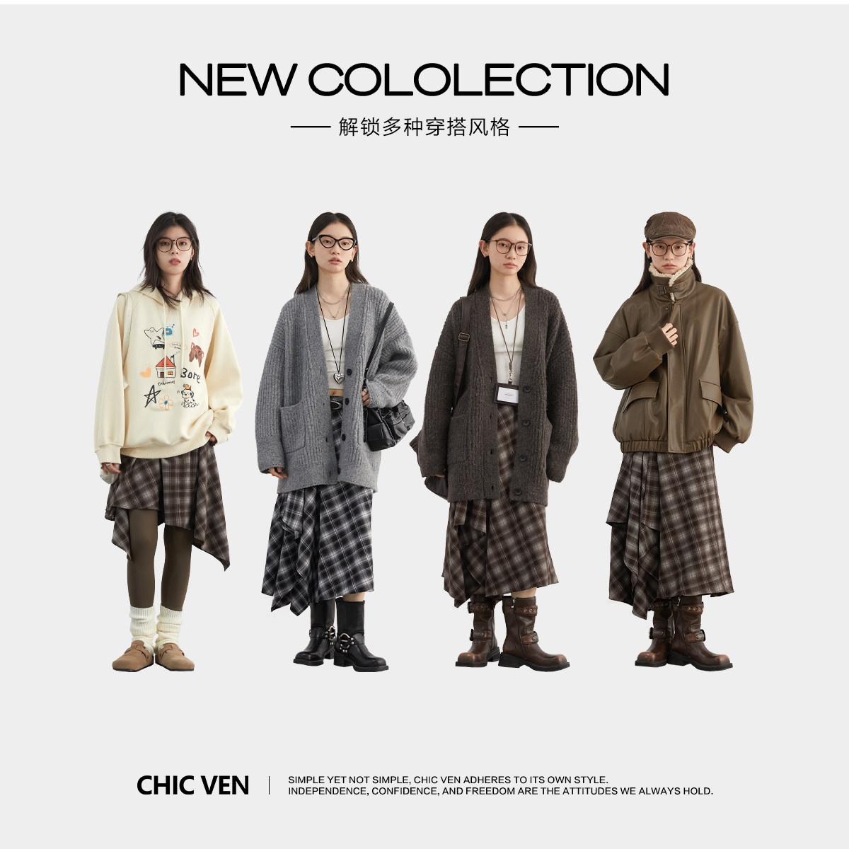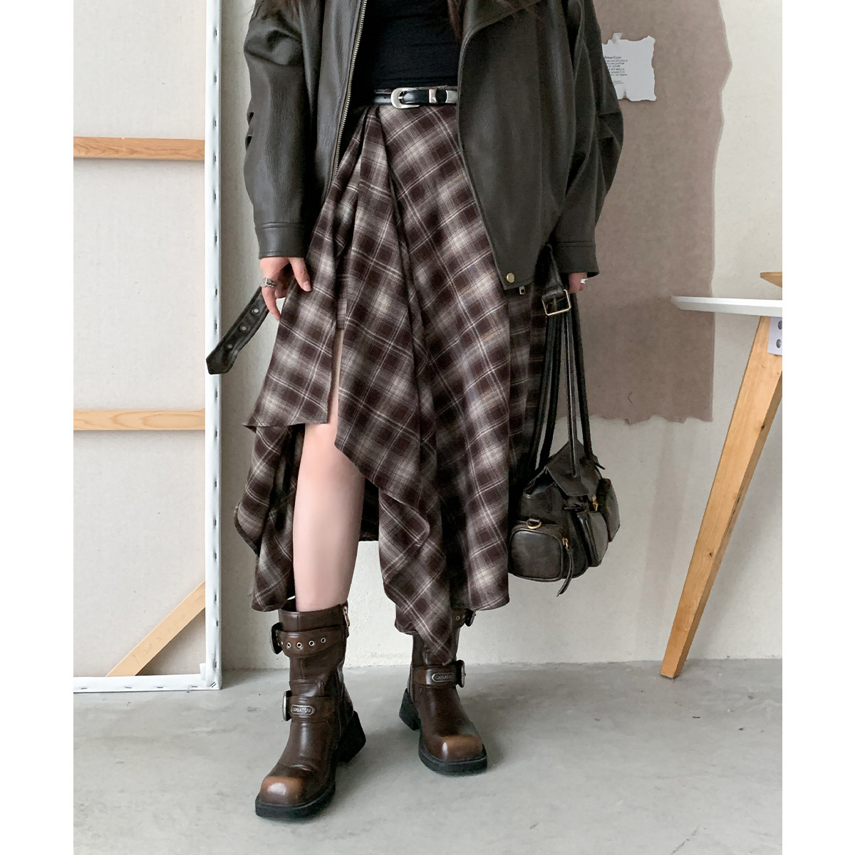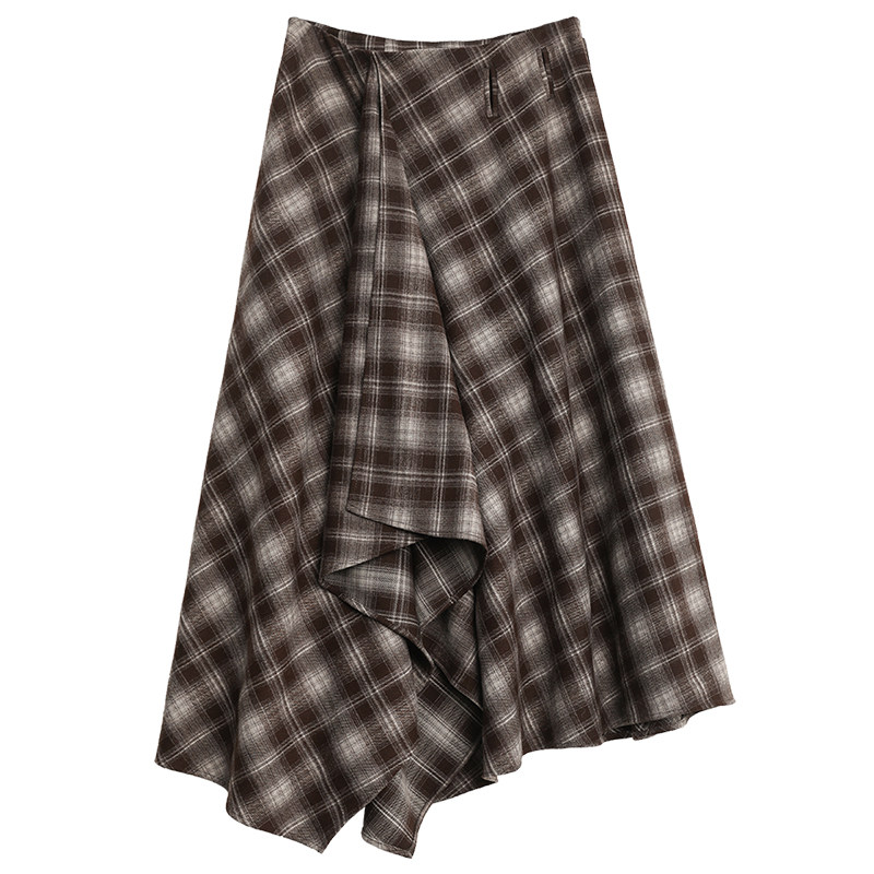 淘宝CV大码女装秋款设计感高腰不规则半身裙撞色格纹磨毛中长裙女胖mm