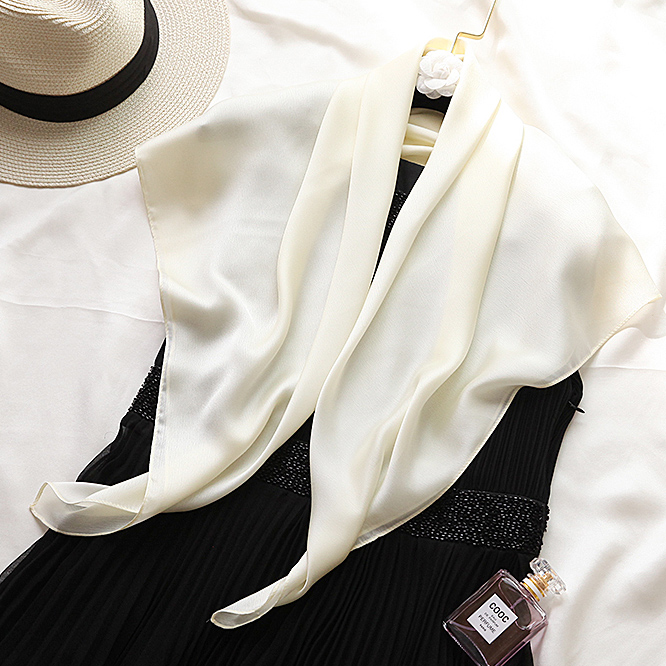 天猫高端杭州丝绸缎面真丝方巾纯色春秋冬季百搭丝巾乳白米黄色女围巾