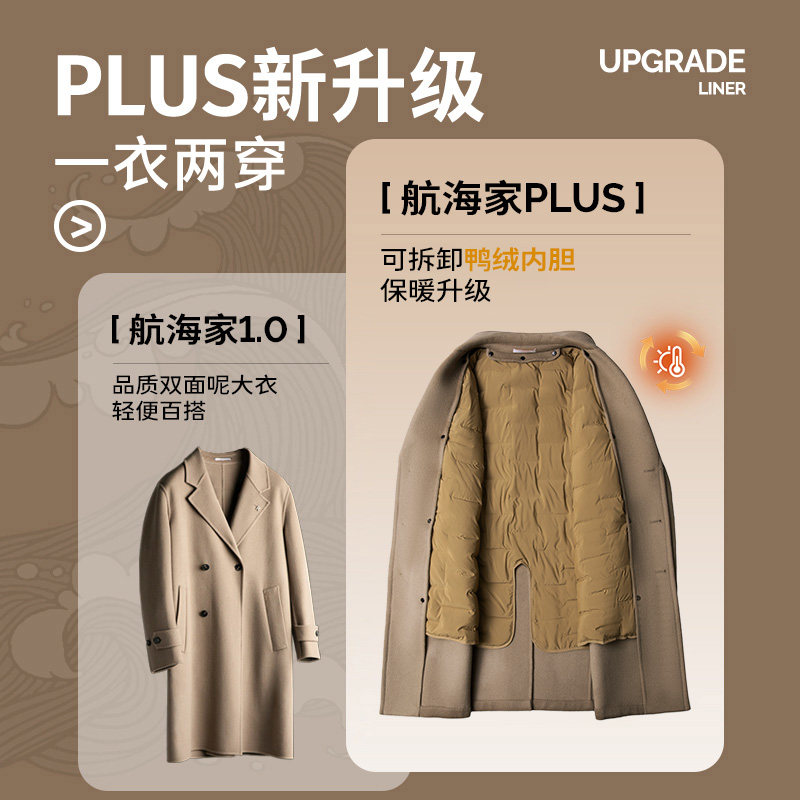 HLA/海澜之家含羊毛大衣秋冬加厚可脱卸鹅绒内胆双面呢外套男
