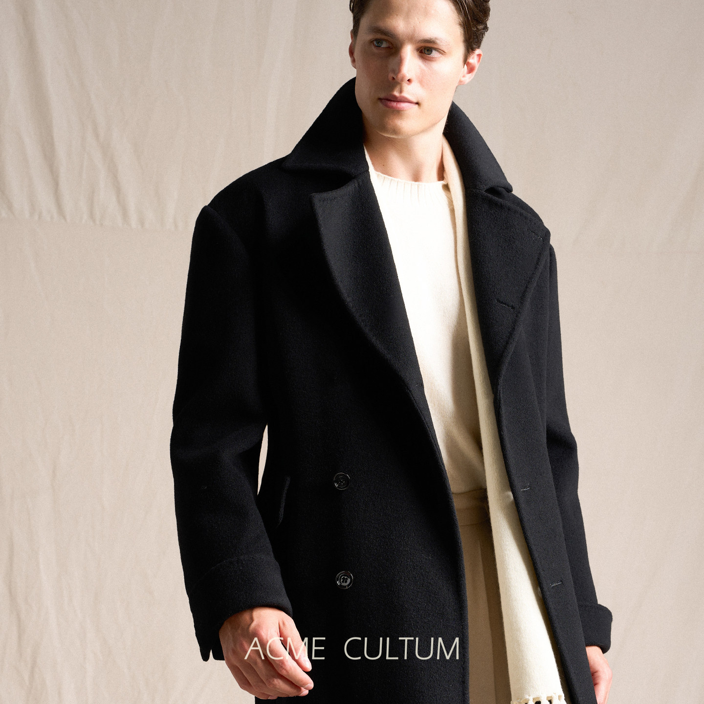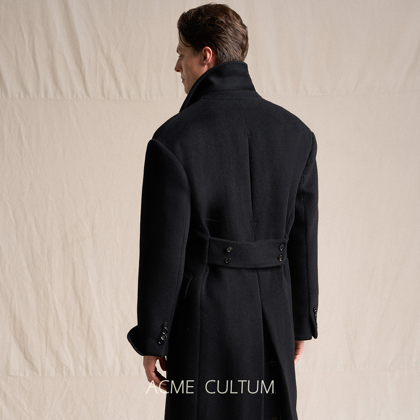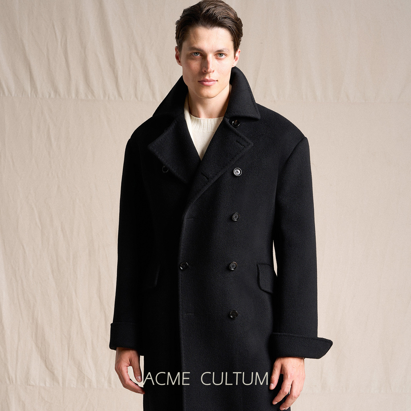 天猫Acme cultum桑蚕丝羊毛加厚翻领长款海军毛呢大衣男宽松黑外套