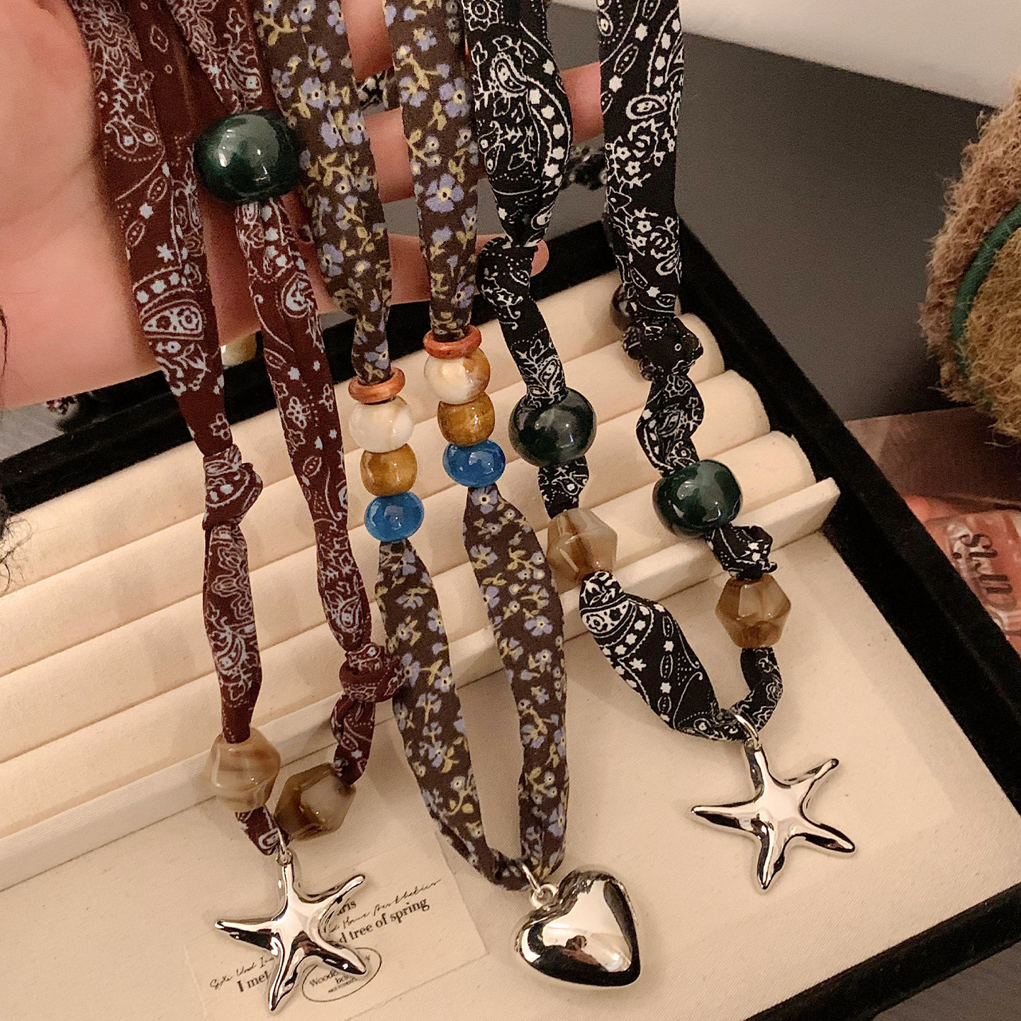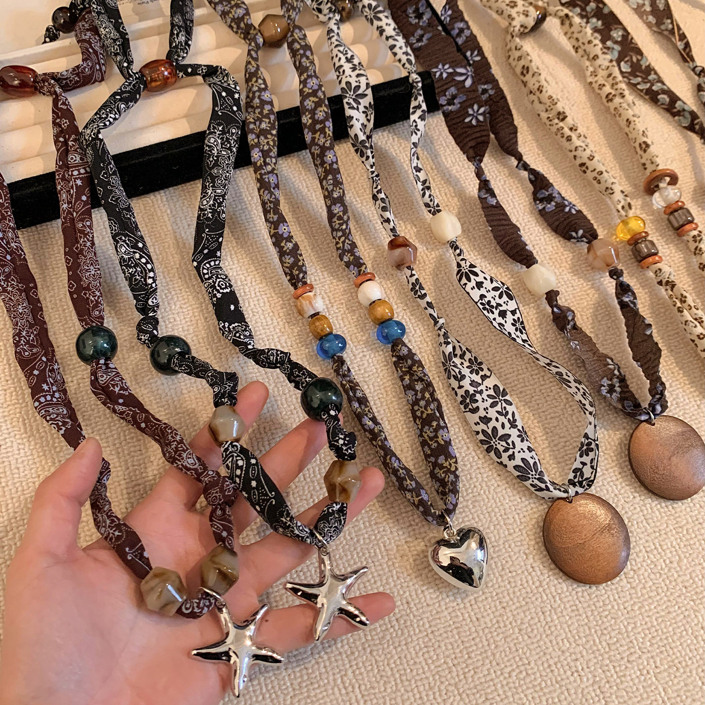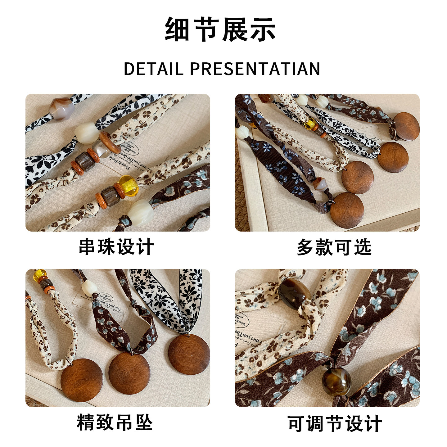 淘宝木质挂牌碎花串珠丝巾项链女小众设计感系脖高级感配饰百搭毛衣链