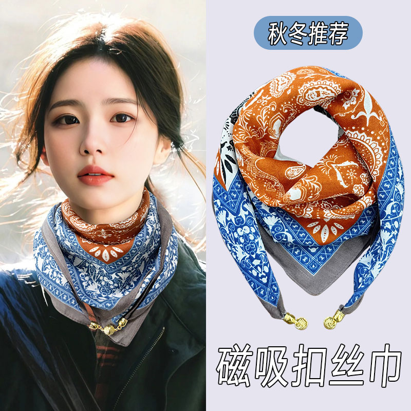 2025新款磁吸扣丝巾女秋冬懒人薄款方巾护颈围巾围脖时尚百搭小方