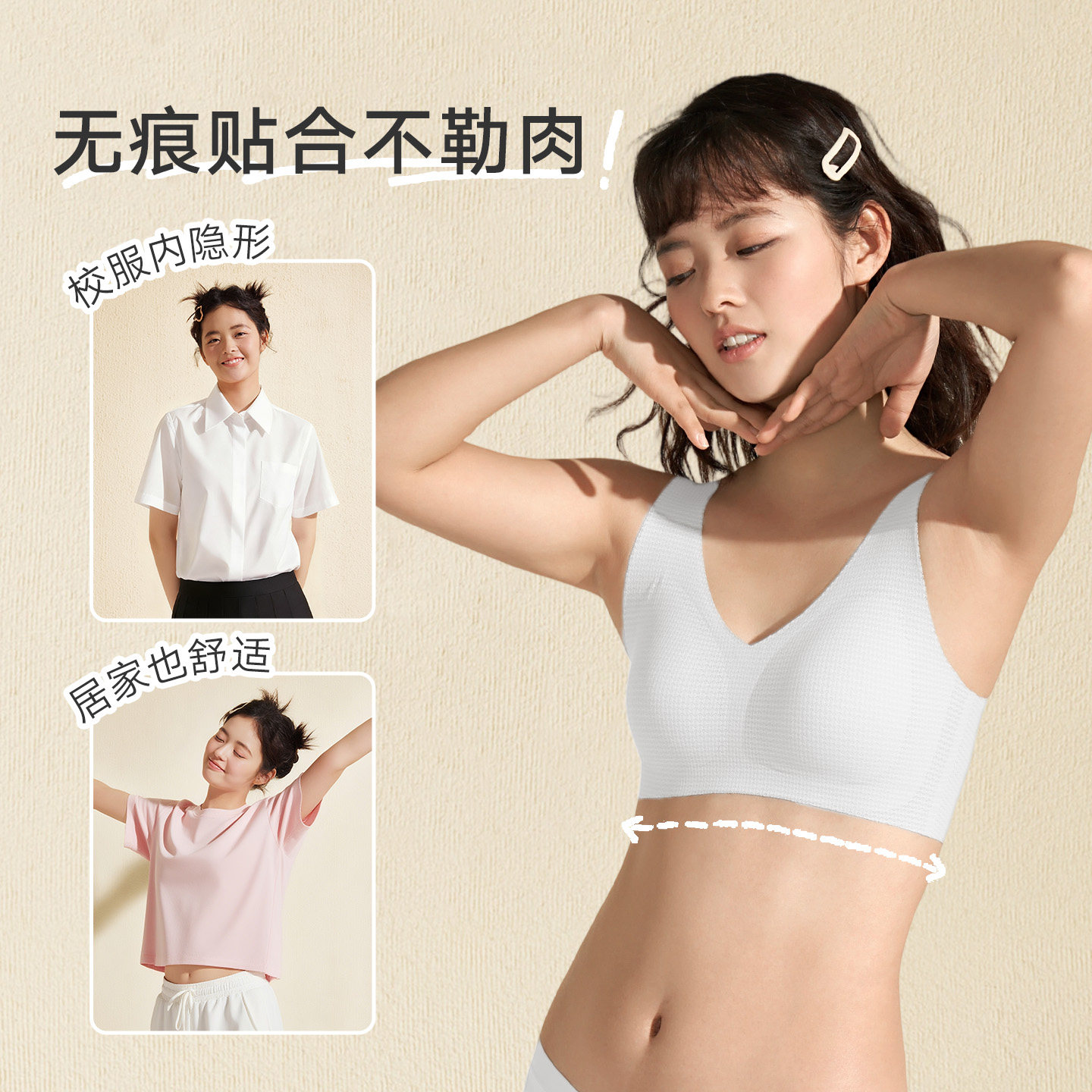 【三阶段】曼妮芬学生少女无痕透气背心文胸,专为青少年发育期设计,科学划分三个成长阶段,贴合不同体型变化。采用高弹亲肤面料,无痕剪裁,穿着舒适不勒身,搭配透气网眼设计,有效排汗散热,保持肌肤干爽。内置抗菌纤维,抑制细菌滋生,呵护少女娇嫩肌肤。无钢圈结构,温柔承托,避免压迫发育中的胸部,兼顾健康与美观。简约背心式设计,可搭配校服或日常穿搭,隐形不显痕。曼妮芬专注女性内衣研发,以安全材质与人性化设计,陪伴少女自信成长,是青春期贴心之选。