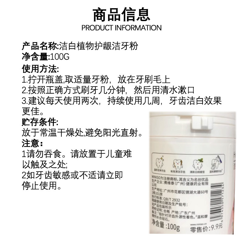 淘宝miniso名创优品洁白植物护龈洁牙粉白桃薄荷味健康刷牙清新口气