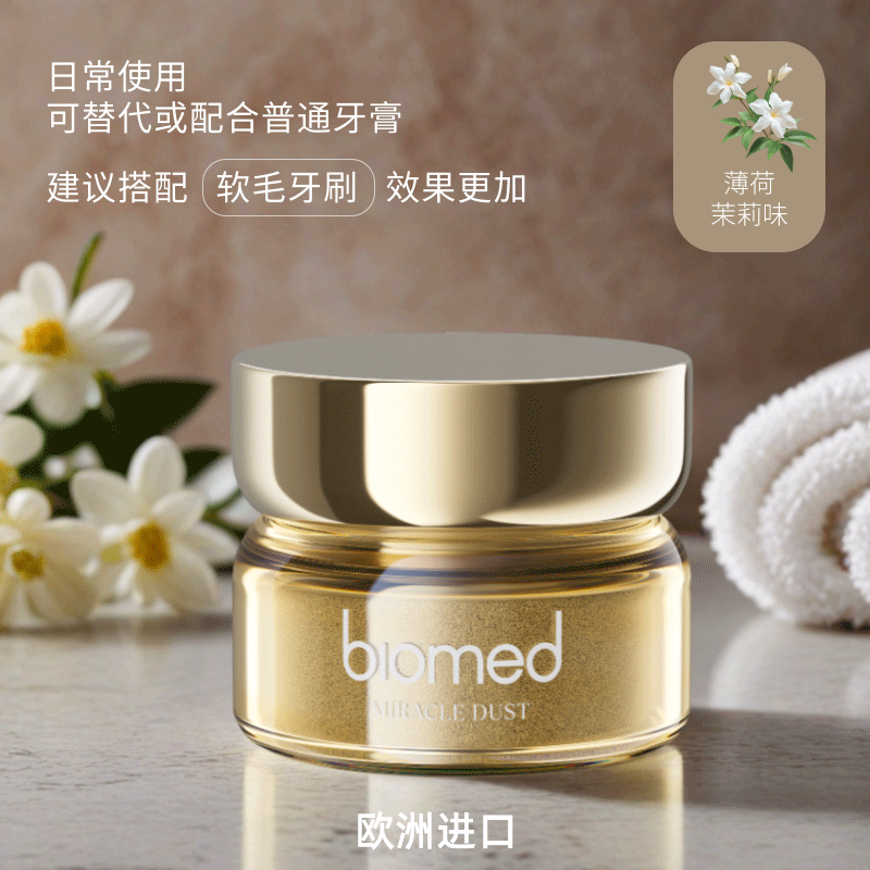 【自营】biomed进口牙粉,源自欧洲品质之选,专为成人设计。采用天然成分精制而成,无氟配方温和护龈,适合敏感口腔人群。独特茉莉花香,带来清新怡人的使用体验,有效去除口腔异味,持久保持口气清新。细腻粉末深入牙缝,深层清洁牙渍与污垢,帮助维护牙齿自然亮白。不含人工色素与防腐剂,安全放心。每日使用,温和呵护牙釉质,提升口腔健康水平。biomed牙粉,以专业品质守护您的自信笑容,是追求天然洁齿方式的理想选择。自营直发,品质保障,让您轻松拥有清新健康的口腔环境。