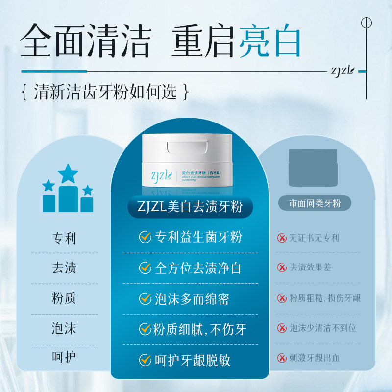 zjzl牙粉专为深层清洁与牙齿美白设计,蕴含天然矿物研磨成分与植物精华,能温和有效去除牙渍、茶渍、烟渍及牙垢,快速分解牙面黄斑,恢复牙齿自然亮白。其微细颗粒深入牙缝,清除顽固污垢与牙结石前体,抑制细菌滋生,从根源改善口臭问题,令口腔持久清新。使用后牙齿光滑洁净,口气清新怡人。适合日常护理,尤其适合吸烟、饮茶咖啡人群。坚持使用,可显著提升牙齿亮白度,呵护牙龈健康,带来专业级洁齿体验,让笑容更自信迷人。
