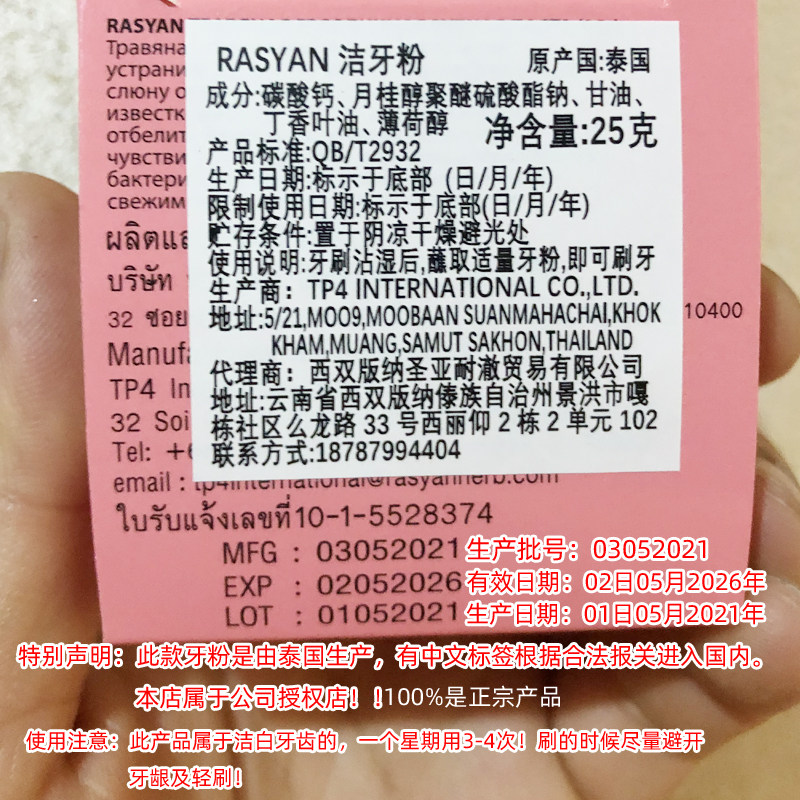 泰国RASYAN牙膏粉洗牙粉黄牙亮白牙齿除牙石去牙渍口气清新除牙垢