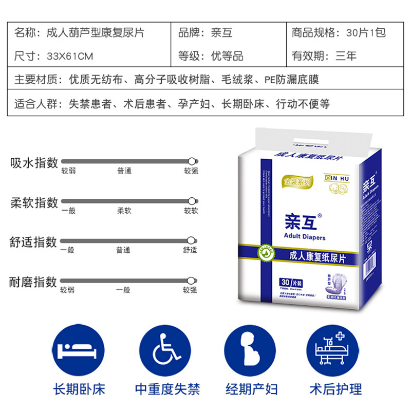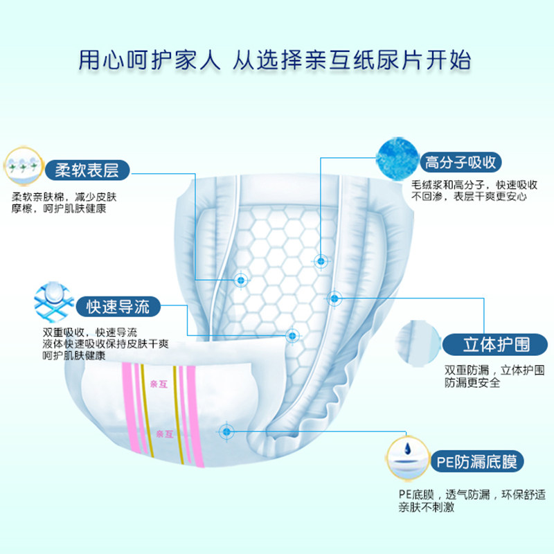 亲互老人纸尿片采用葫芦型立体设计,专为女性老年人研发,贴合身体曲线,有效防漏。精选高吸收高分子材料,快速锁水,保持表层干爽,减少皮肤刺激与红疹风险。柔软亲肤表层,透气性好,长时间使用亦舒适安心。加宽后腰及侧边防漏隔边设计,夜间使用更安心。适用于失禁、术后康复或行动不便的老年女性,提供全天候贴心护理。亲互注重品质与尊严,让护理更轻松,让晚年更体面。是家庭护理的理想之选,关爱老人,从细节开始。