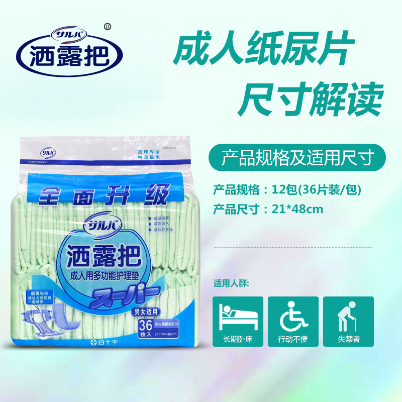 洒露老人护理用品系列,专为失禁老人贴心设计,包含成人纸尿裤、纸尿片和护理垫等多款产品,36片装热销爆款,性价比极高。采用高分子吸收芯体,快速锁水、防漏透气,有效减少异味,保持肌肤干爽舒适。立体防漏隔边设计,贴合身形,安心防侧漏;柔软亲肤表层,呵护脆弱肌肤,减少摩擦不适。适用于卧床、行动不便或轻度至中度失禁的老年人。洒露以专业品质赢得万千家庭信赖,让护理更轻松,让长者更有尊严。关爱老人,从细节做起,洒露用心守护每一份晚年安康。