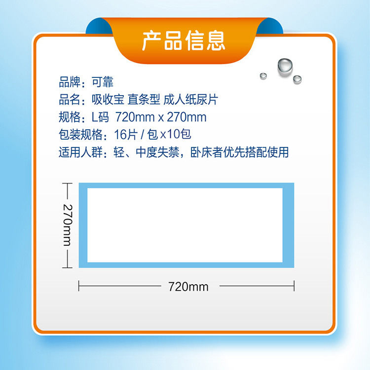 可靠吸收宝成人纸尿片(720×270mm)专为老年人及行动不便人群设计,采用直条型加长加大版型,贴合身体曲线,有效防漏。表层柔软亲肤,减少摩擦不适;高分子吸收芯体快速锁水,保持干爽长达8小时,避免闷热与红疹。立体防漏隔边设计,全方位防止侧漏,夜间使用更安心。透气底膜排出湿气,提升舒适度。适用于轻度至中度失禁人群,穿脱便捷,可搭配护理裤使用。可靠吸收宝以高品质材料与人性化设计,守护使用者尊严与舒适,是家庭护理的理想选择,让照护更轻松,生活更有品质。