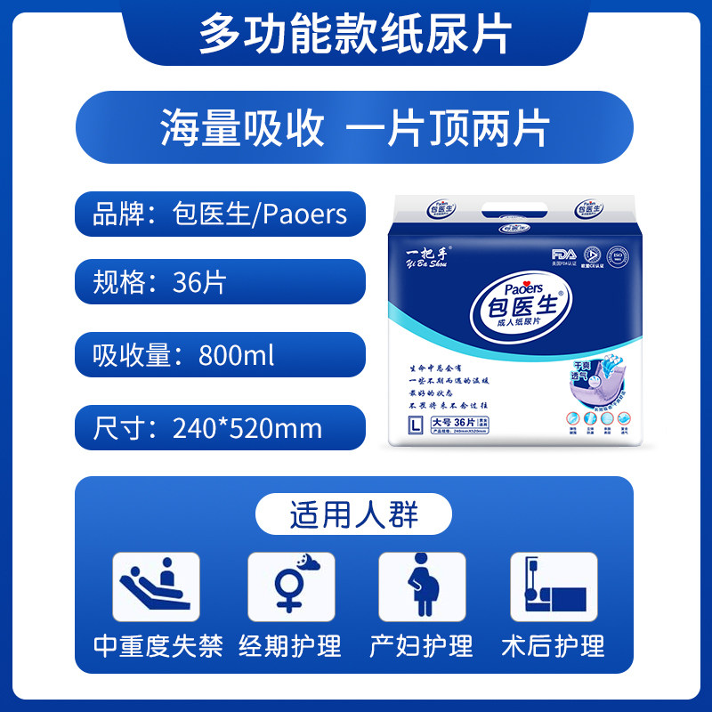 包医生成人纸尿片专为失禁人群设计,适用于老年人、产妇及术后康复患者,男女通用。采用高吸收芯体,快速锁水防漏,保持表层干爽,减少皮肤刺激与红疹风险。立体防漏隔边有效防止侧漏,提升使用安全感。柔软亲肤表层贴合身体,透气性好,长时间穿戴更舒适。L码适合臀围较大的用户,36片装满足日常护理需求。产品通过安全检测,无荧光剂、无异味,呵护敏感肌肤。无论是居家护理还是外出使用,包医生成人纸尿裤都以贴心设计和高品质,为使用者提供尊严与舒适,减轻照护负担,是家庭护理的理想选择。