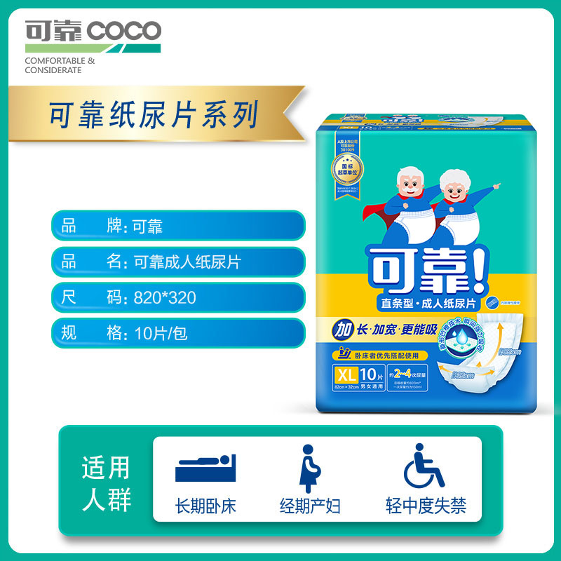 可靠成人纸尿片(820×320mm)直条型专为女性老年用户设计,加大号尺寸提供更强吸收力和舒适贴合感。采用高分子吸收芯体,快速锁水防漏,有效减少回渗,保持肌肤干爽。立体防漏隔边设计,防止侧漏,提升夜间及长时间使用安全性。表层柔软亲肤,减少摩擦不适,适合失禁或行动不便的老年人日常护理。整箱80片装,经济实惠,满足家庭长期需求。产品通过严格质量检测,安全无刺激,是居家养老、护理机构优选的成人护理用品,兼顾隐私与尊严,让照护更省心、使用者更安心。
