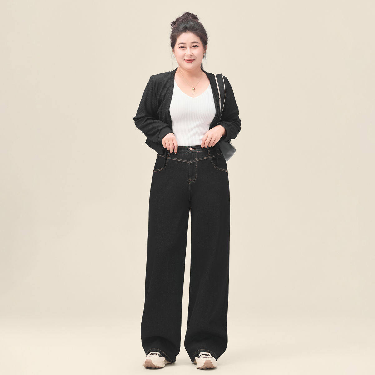 淘窄版阔腿牛仔裤女秋冬加绒保暖长裤大码胖mm弹力高腰显瘦直筒裤子