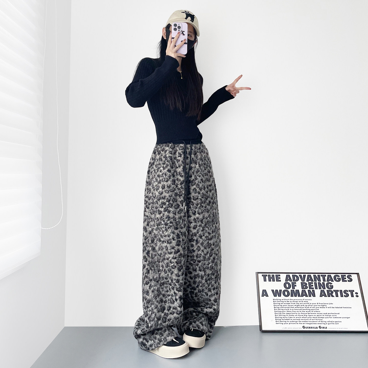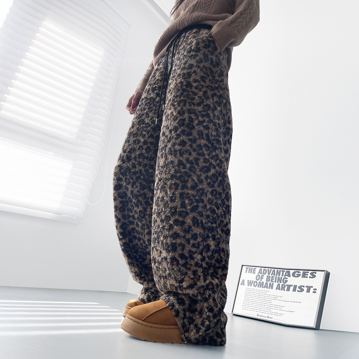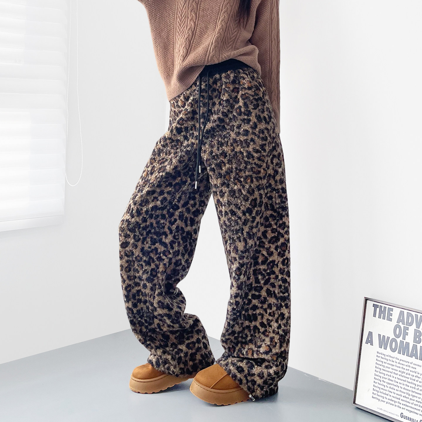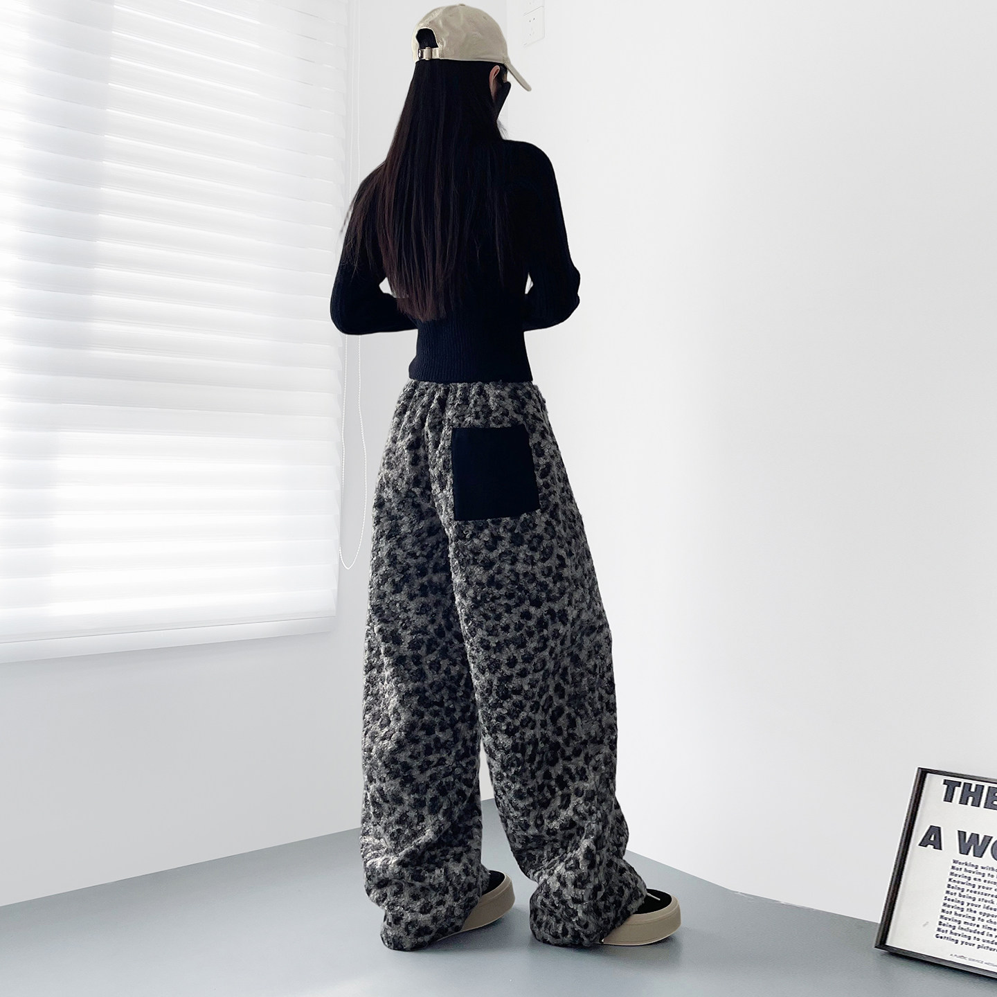 天猫酷飒个性毛绒豹纹阔腿裤女冬季新款大码胖mm设计感辣妹休闲直筒裤