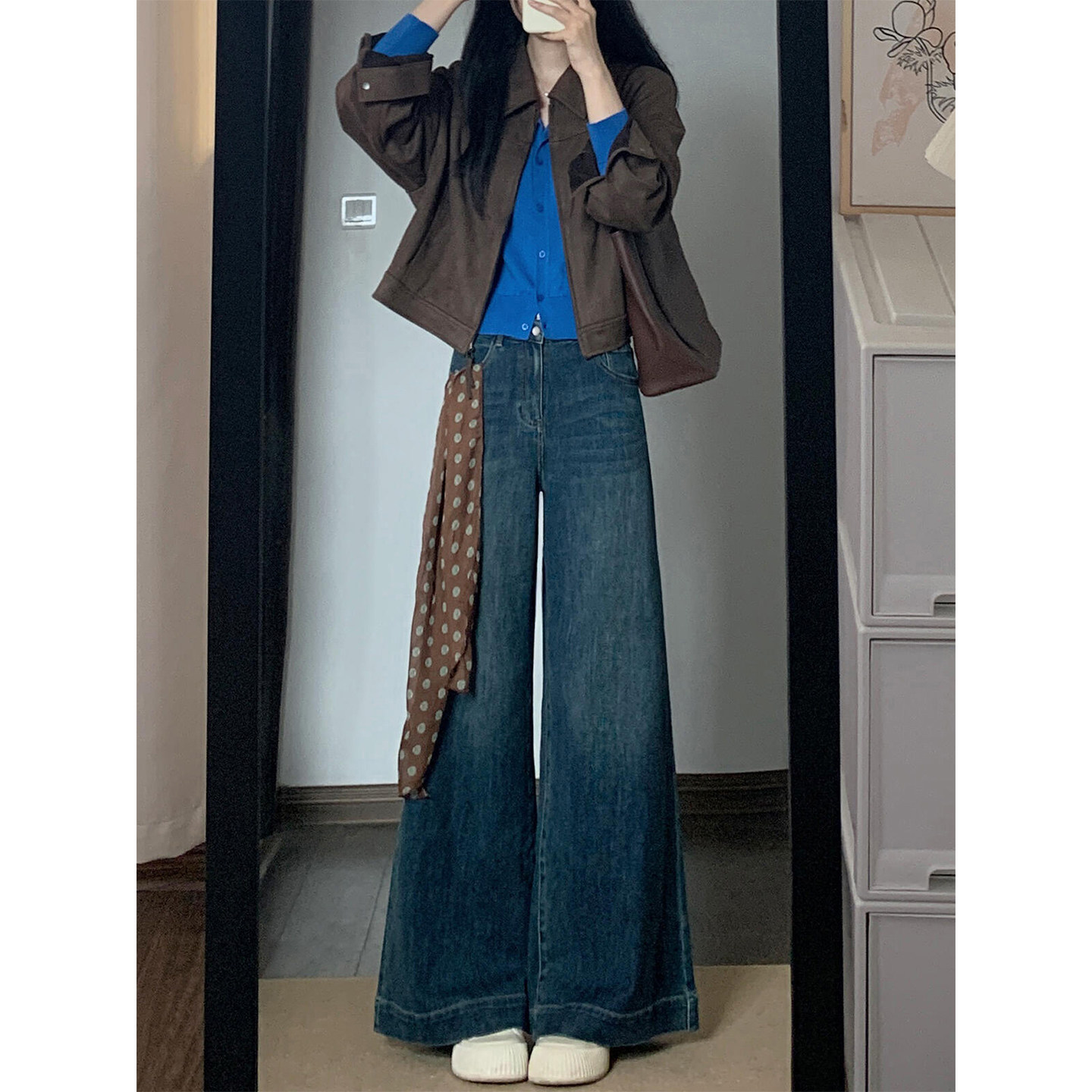 淘复古棕咖色阔腿牛仔裤女秋冬新款胖mm大码宽松显瘦高腰垂感直筒裤