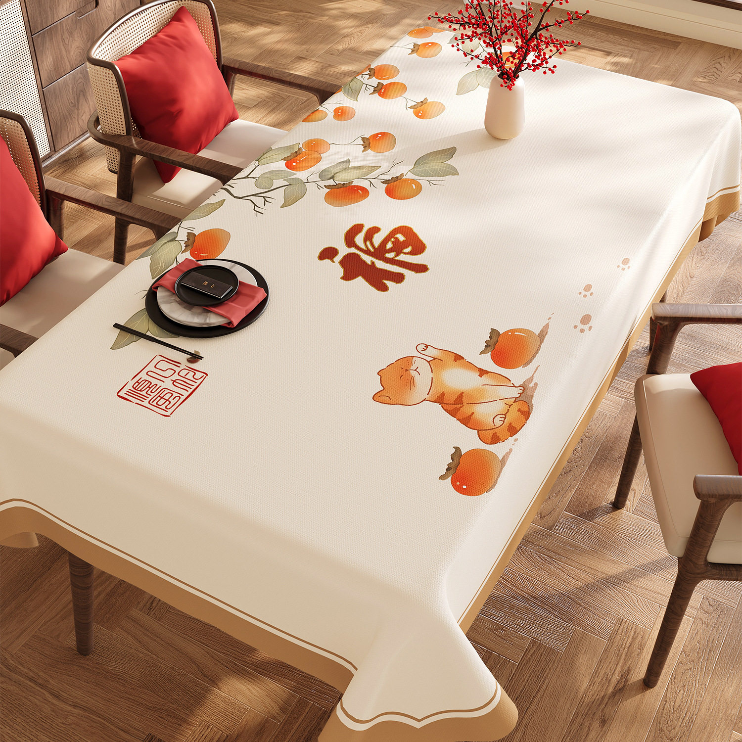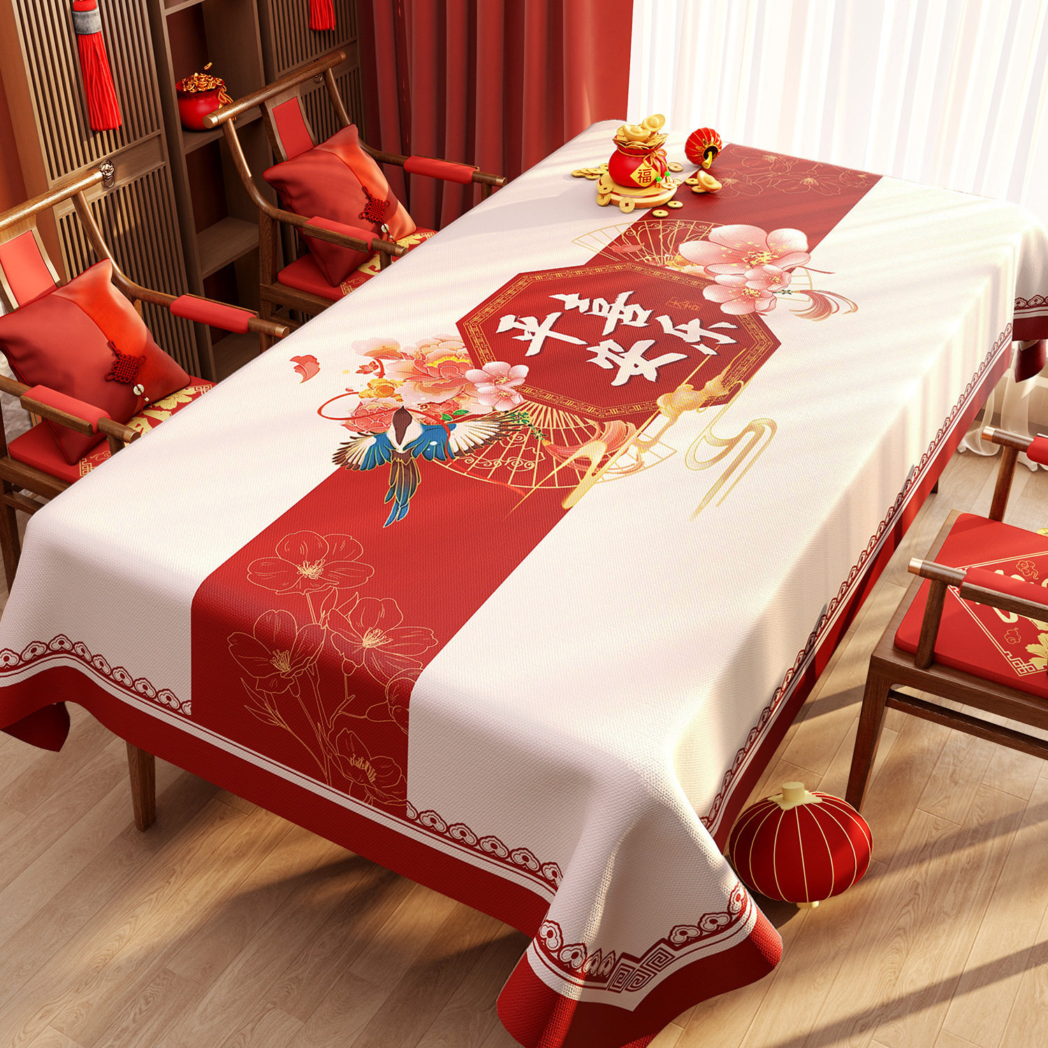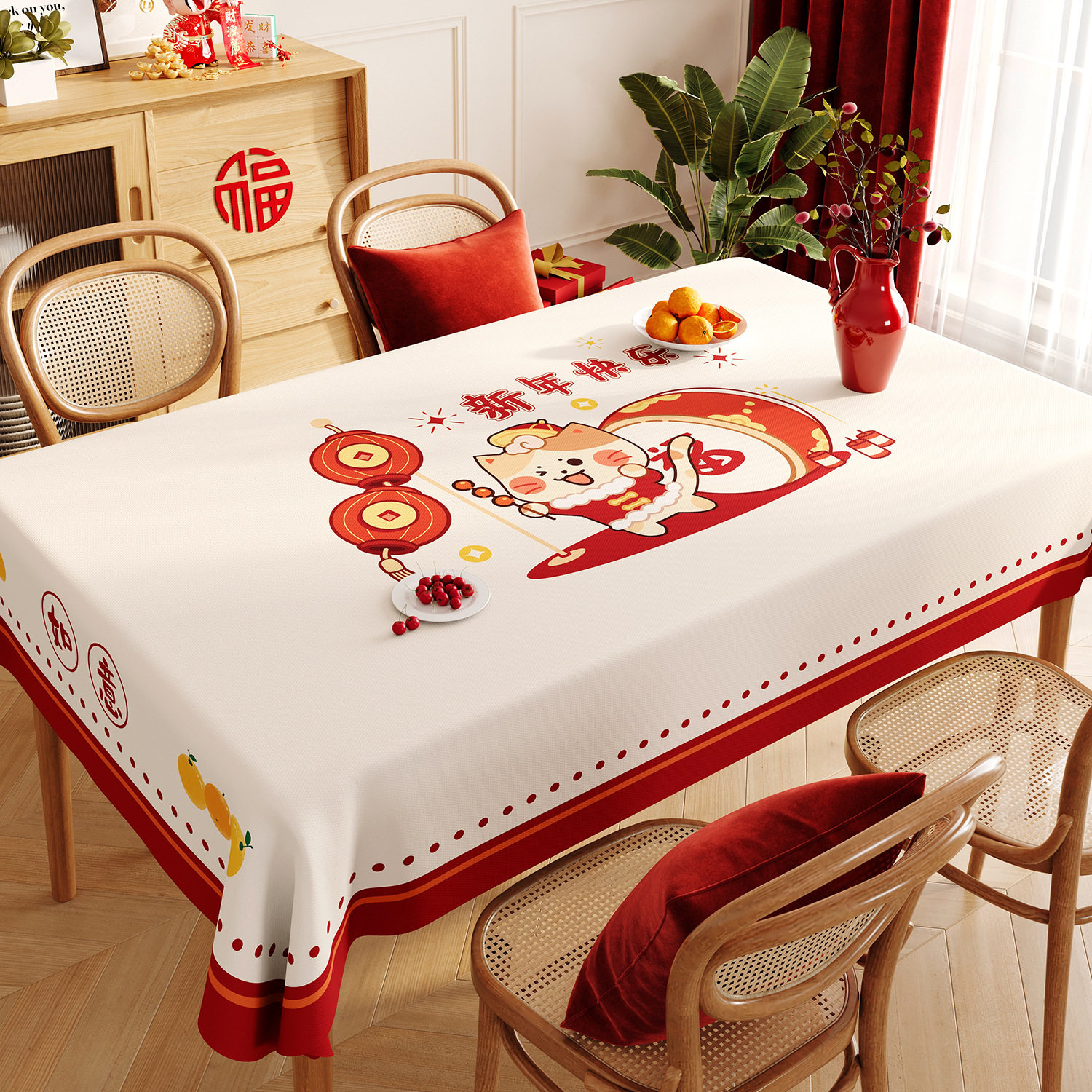 新年装饰福字防水防油免洗餐桌布,采用优质PVC材质,专为春节喜庆氛围打造。长方形设计,完美适配茶几、餐桌等多种家具,红色底色搭配金色“福”字图案,寓意吉祥如意、福运满堂。表面光滑,具备出色的防水防油性能,日常用餐或聚会时油渍、水渍一擦即净,免洗便捷,轻松打理。材质环保无味,结实耐用,不易刮花变形。无论是家庭聚餐、走亲访友,还是节日布置,都能增添浓浓年味,让新年更有仪式感。是春节家居装饰的理想之选,实用与美观兼具,开启红火好运年。