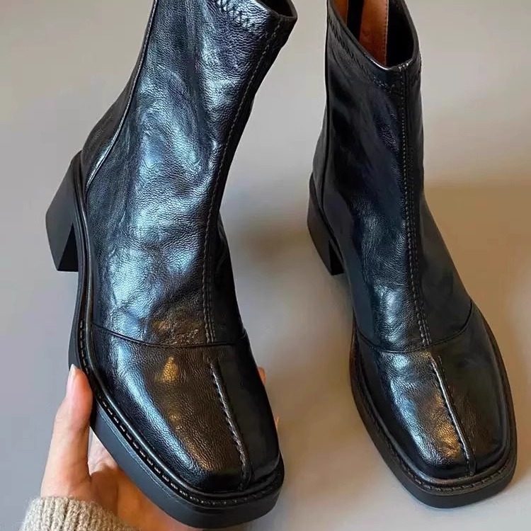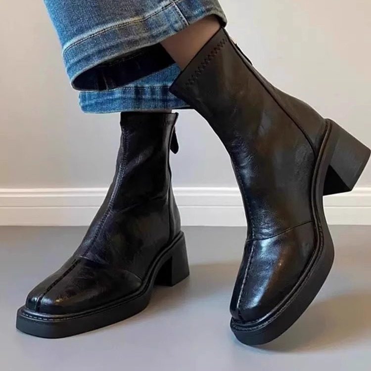 淘宝2025新款复古高跟女短靴方头小众弹力靴秋冬粗跟做旧软皮瘦瘦靴子