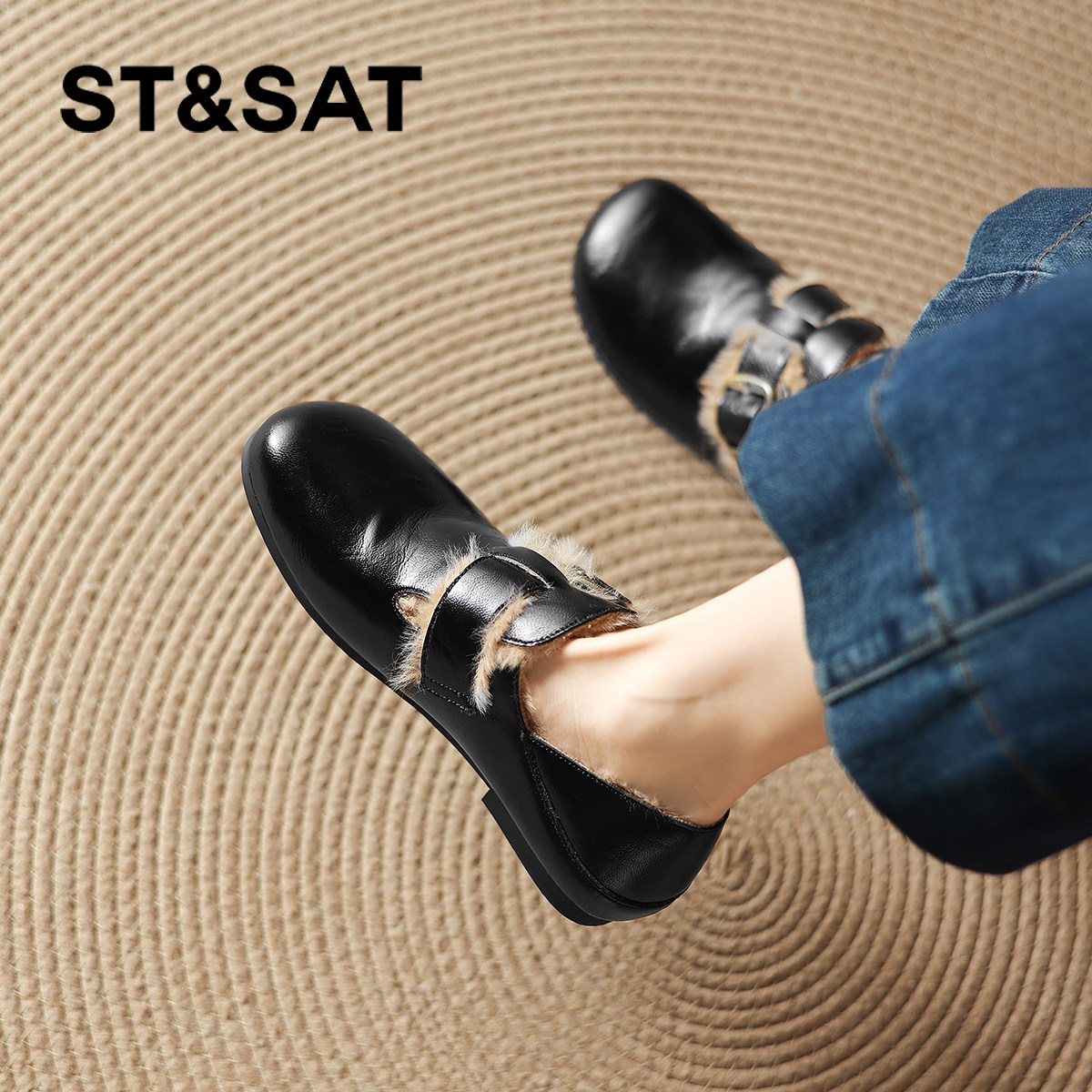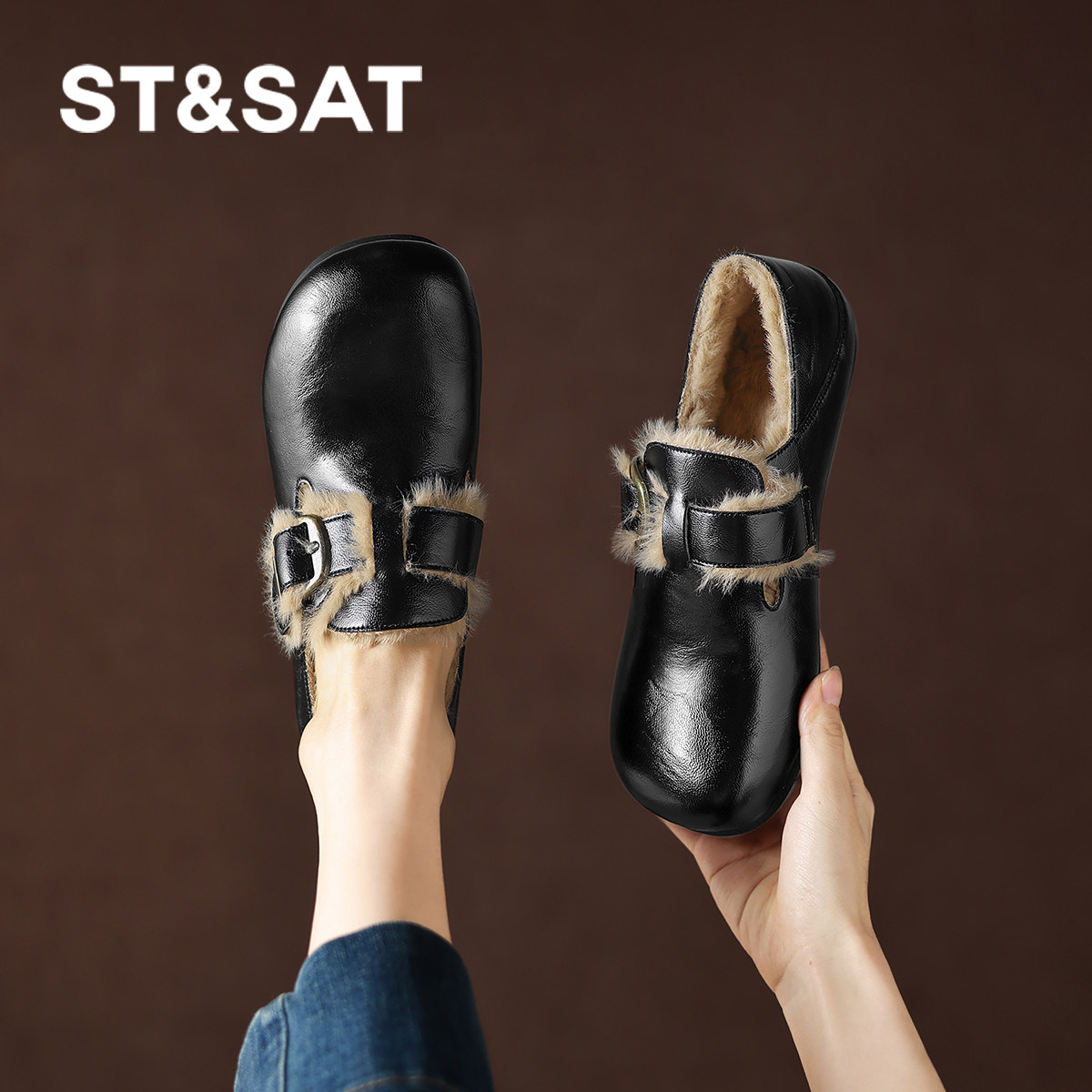 天猫星期六加绒勃肯鞋女2025新款冬季羊皮女鞋保暖棉鞋平底黑色乐福鞋